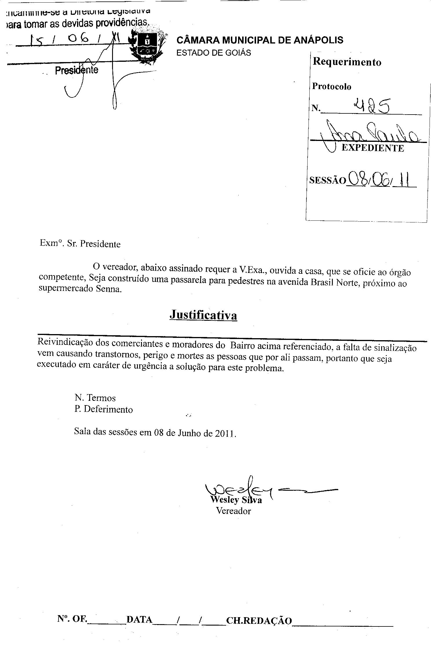Ementa: O VEREADOR, ABAIXO ASSINADO REQUER A V.EXA., OUVIDA A CASA, QUE SE OFÍCIE AO ÓRGÃO COMPETENTE, SEJA CONSTRUÍDO UMA PASSARELA PARA PEDESTRES NA AVENIDA BRASIL NORTE, PRÓXIMO AO SUPERMERCADO SENNA.