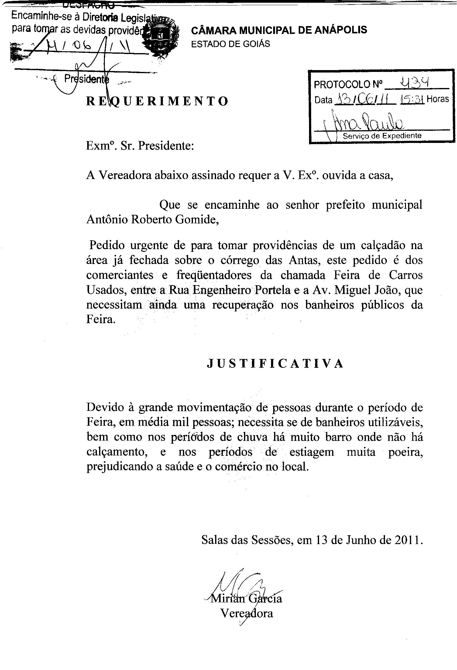 Ementa: A VEREADORA ABAIXO ASSINADO REQUER A V.EXº. OUVIDA A CASA,QUE SE ENCAMINHE AO SENHOR PREFEITO MUNICIPAL ANTÔNIO ROBERTO GOMIDE, PEDIDO URGENTE PARA TOMAR PROVIDÊNCIAS DE UM CALÇADÃO NA ÁREA JÁ FECHADA SOBRE O CÓRREGO DAS ANTAS, ESTE PEDIDO É DOS COMERCIANTES E FREQUENTADORES DA CHAMADA FEIRA DE CARROS USADOS, ENTRE A RUA ENGENHEIRO PORTELA E AV. MIGUEL JOÃO, QUE NECESSITAM AINDA UMA RECUPERAÇÃO NOS BANHEIROS PÚBLICOS DA FEIRA.
