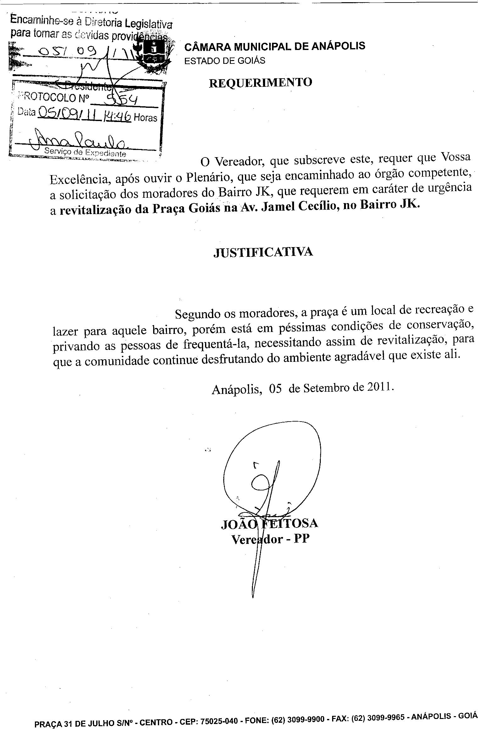 Ementa: O VEREADOR, QUE SUBSCREVE, REQUER QUE VOSSA EXELÊNCIA, APÓS OUVIR O PLENÁRIO, QUE SEJA ENCAMINHADO AO ÓRGÃO COMPETENTE, A SOLICITAÇÃO DOS MORADORES DO BAIRRO JK, QUE REQUEREM EM CARÁTER DE URGENCIA A REVITALIZAÇÃO DA PRAÇA GOIÁS NA AV. JAMEL CECILIO, NO BAIRRO JK.
