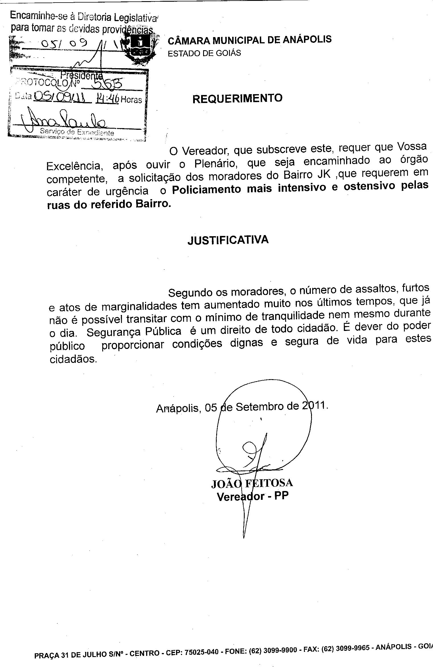 Ementa: O VEREADOR QUE SUBSCREVE ESTE, REQUER QUE VOSSA EXELENCIA, APOS OUVIR O PLENÁRIO, QUE SEJA ENCAMINHADO AO ÓRGÃO COMPETENTE, A SOLICITAÇÃO DOS MORADORES DO BAIRRO JK, QUE REQUEREM EM CARÁTER DE URGÊNCIA O POLICIAMENTO MAIS INTENCIVO E OSTENCIVO PELAS RUAS DO REFERIDO BAIRRO.