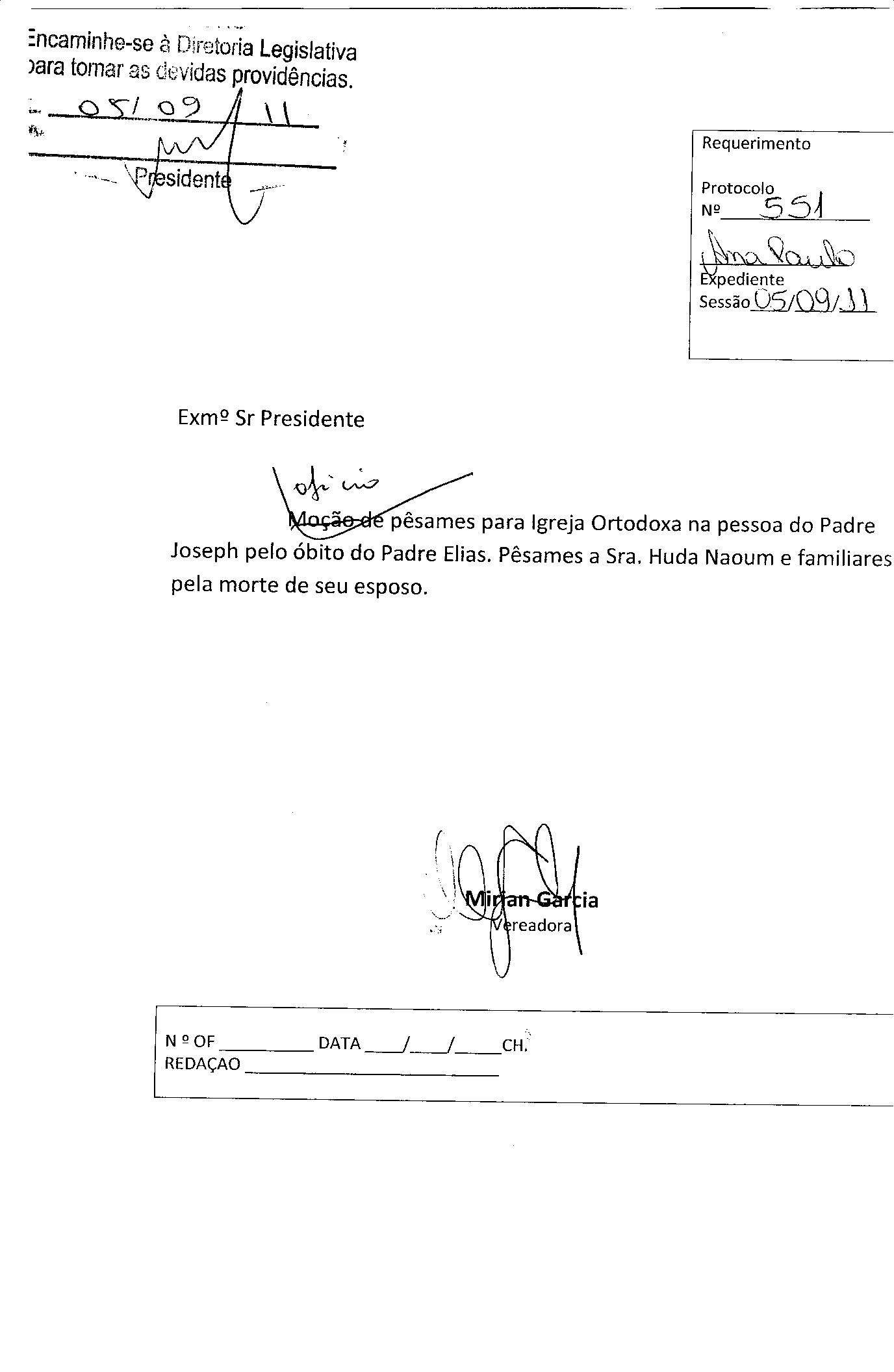 Ementa: MOÇÃO DE PÊSAMES PARA A IGREJA ORTODOXA NA PESSOA DO PADRE JOSEPH PELO ÓBITO DO PADRE ELIAS. PÊSAME A SRA. HUDA NAOUM E FAMILIARES PELA MORTE DE SEU ESPOSO.