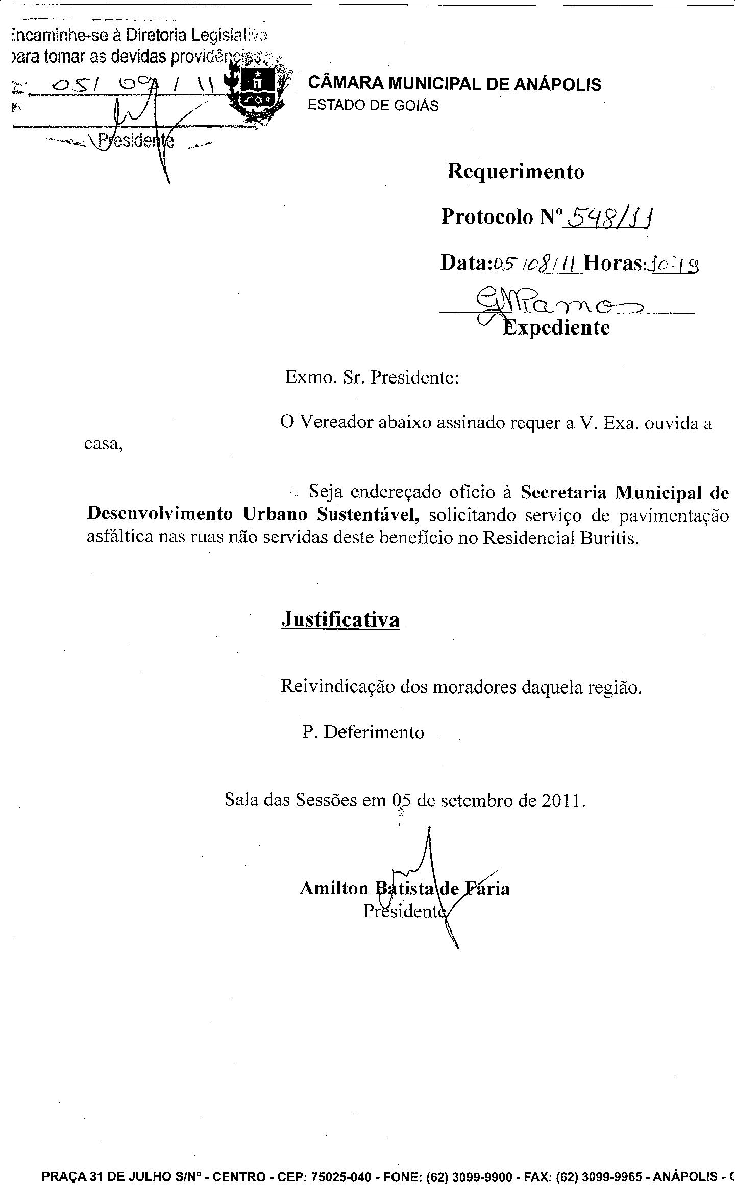 Ementa: O VEREADOR, ABAIXO ASSINADO REQUER A V.EX° OUVIDA A CASA, SEJA ENCAMINHADOOFÍCIO À SECRETARIA MUNICIPAL DE DESENVOLVIMENTO URBANO SUSTENTÁVEL, SOLICITANDO SERVIÇO DE PAVIMENTAÇÃO ASFÁTICA NAS RUAS NÃO SERVIDAS DESTE BENEFÍCIO NO RESIDENCIAL BURITIS.