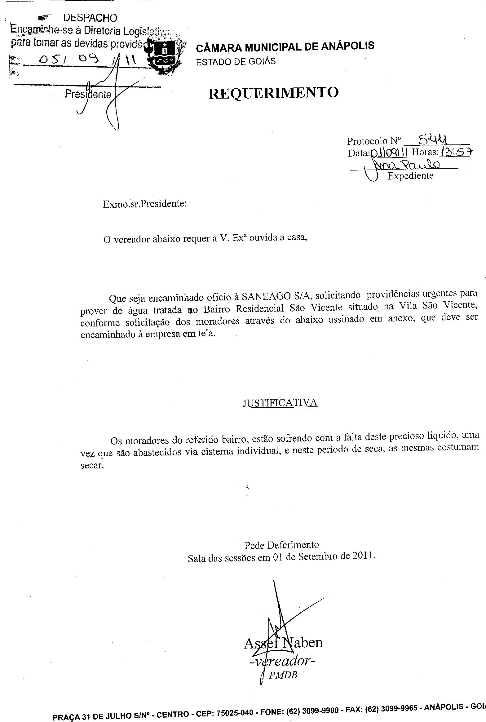 Ementa: O VEREADOR, ABAIXO ASSINADO REQUER A V.EX° OUVIDA A CASA, QUE SEJA ENCAMINAHDO OFÍCIO À SANEAGO S/A, SOLICITANDO PROVIDÊNCIAS URGENTES PARA PROMOVER DE ÁGUA TRATADA NO BAIRRO RESIDENCIAL SÃO VICENTE SITUADO NA VILA SÃO VICENTE, CONFORME SOLICITAÇÃO DOS MORADORES ATRAVÉS DO ABAIXO ASSINADO EM ANEXO, QUE DEVE SER ENCAMINHADO À EMPRESA EM TELA.