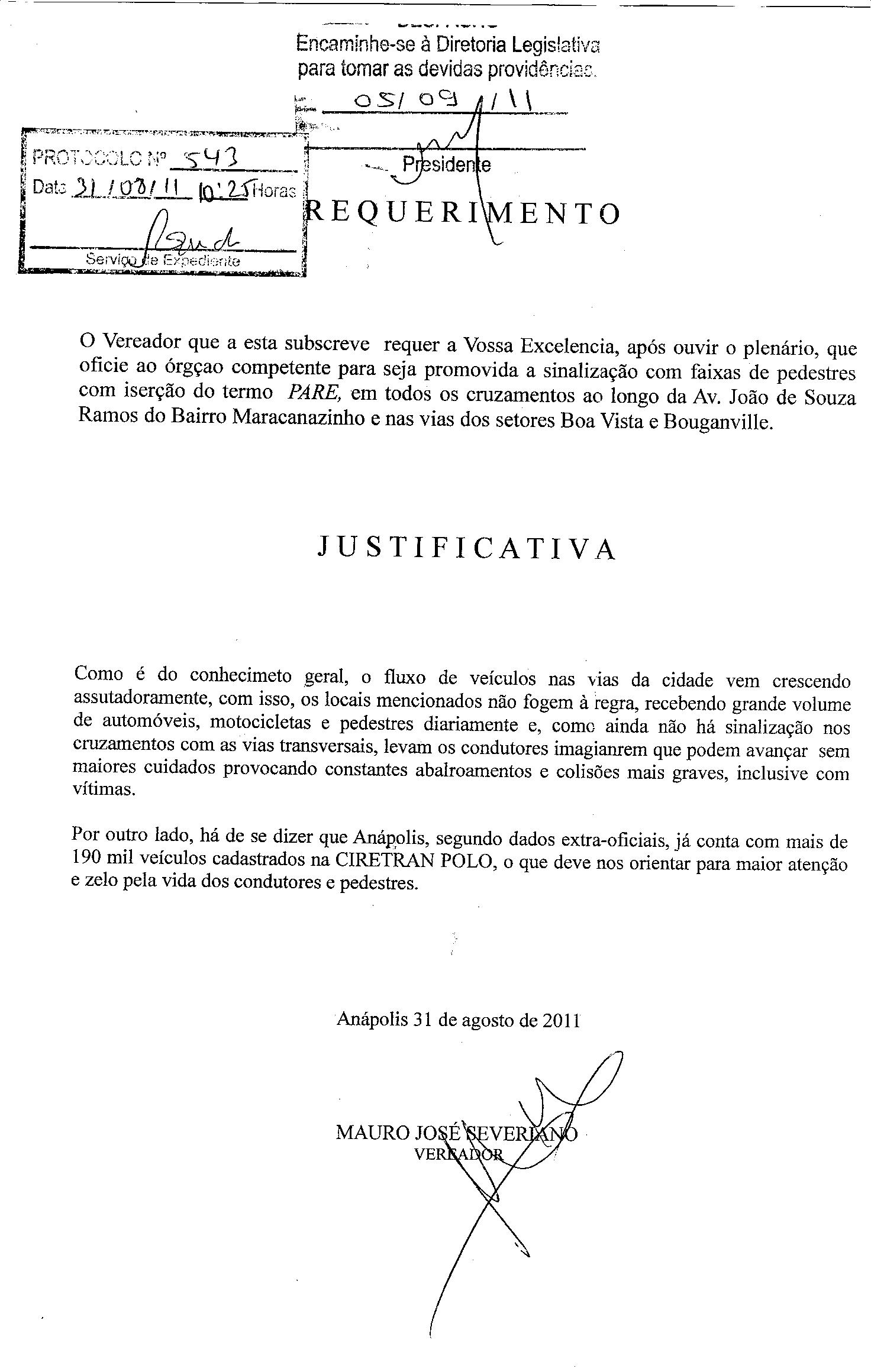 Ementa: O VEREADOR QUE A ESTA SUBSCREVE REQUER A VOSSA EXELENCIA, APÓS OUVIR O PLENÁRIO, QUE OFICIE AO ÔRGÃO COMPETENTE PARA QUE SEJA PROMOVIDA A SINALIZAÇÃO COM FAIXAS DE PEDESTRE COM INSERÇÃO DO TERMO PARE, EM TODOS OS CRUZAMENTOS AO LONGO DA AV. JOÃO DE SOUZA RAMOS DO BAIRRO MARACANANZINHO E NAS VIAS DOS SETORES BOA VISTA E BOUGANVILE.