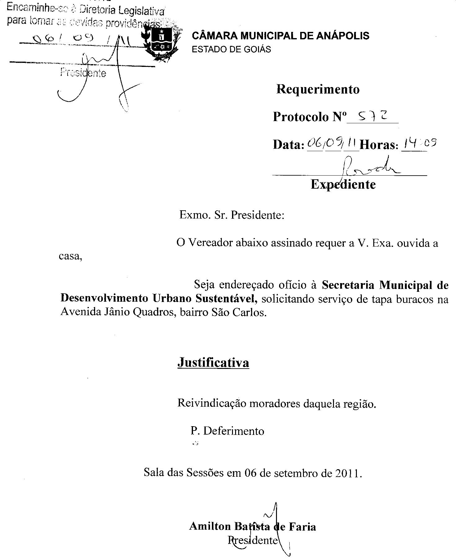 Ementa: O VEREADOR, ABAIXO ASSINADO REQUER A V.EX° OUVIDA A CASA, SEJA ENCAMINHADO OFÍCIO À SECRETARIA MUNICIPAL DE DESENVOLVIMENTO URBANO SUSTENTAVEL, SOLICITANDO SERVIÇO DE TAPA BURACOS NA AVENIDA JÂNIO QUADROS, BAIRRO SÃO CARLOS.