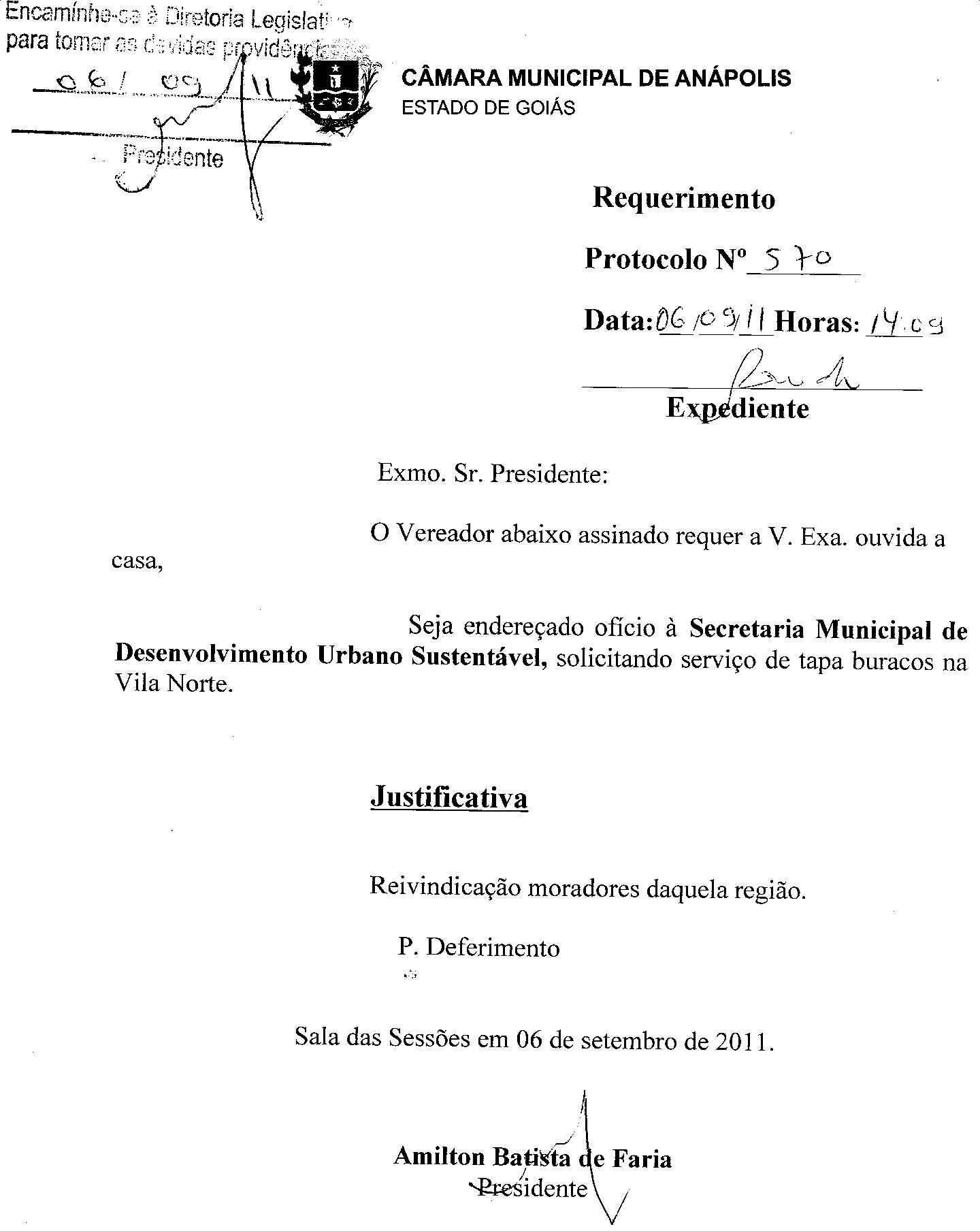 Ementa: O VEREADOR, ABAIXO ASSINADO REQUER A V.EX° OUVIDA A CASA, SEJA ENCAMINHADO OFÍCIO À SECRETARIA MUNICIPAL DE DESENVOLVIMENTO URBANO SUSTENTAVEL, SOLICITANDO SERVIÇO DE TAPA BURACOS NA VILA NORTE.
