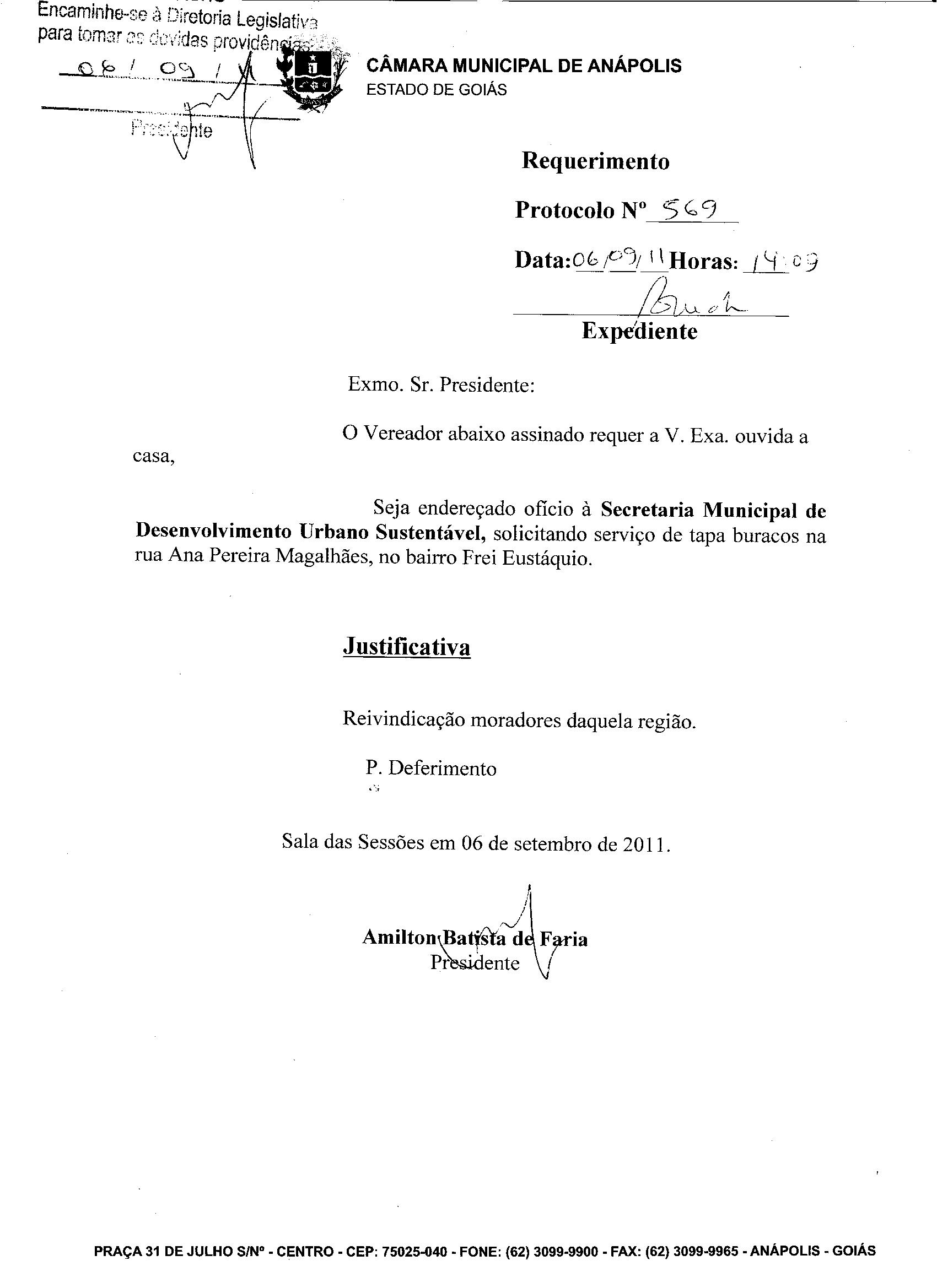 Ementa: O VEREADOR, ABAIXO ASSINADO REQUER A V.EX° OUVIDA A CASA, SEJA ENCAMINHADO OFÍCIO À SECRETARIA MUNICIPAL DE DESENVOLVIMENTO URBANO SUSTENTAVEL, SOLICITANDO SERVIÇO DE TAPA BURACOS NA RUA ANA PEREIRA MAGALHÃES, NO BAIRRO FREI EUSTÁQUIO.