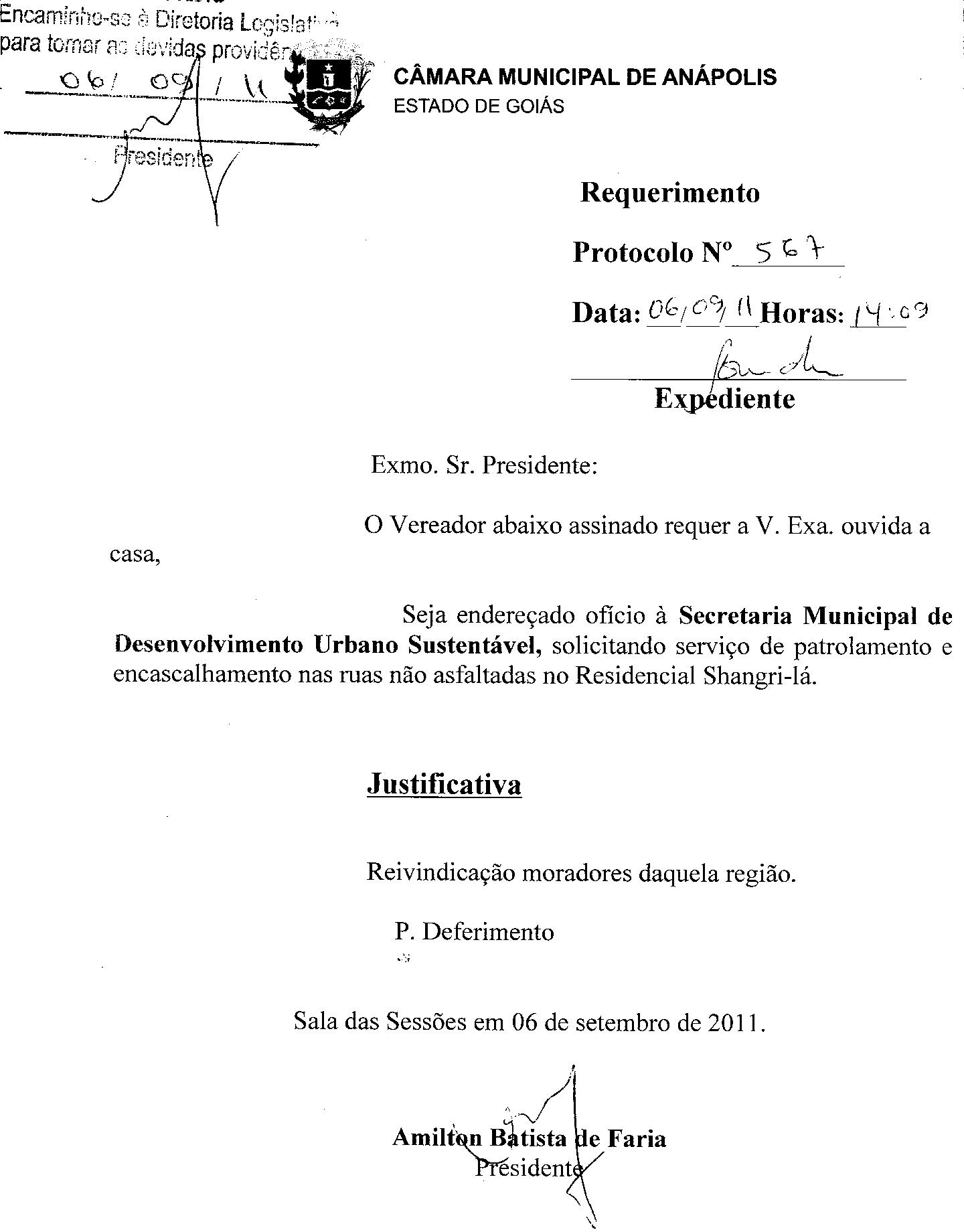 Ementa: O VEREADOR, ABAIXO ASSINADO REQUER A V.EX° OUVIDA A CASA, SEJA ENCAMINHADO OFÍCIO À SECRETARIA MUNICIPAL DE DESENVOLVIMENTO URBANO SUSTENTAVEL, SOLICITANDO SERVIÇO DE PATROLAMENTO E ENCASCALHAMENTO NAS RUAS NÃO ASFALTADAS NO RESIDENCIAL SHANGRI-LÁ.