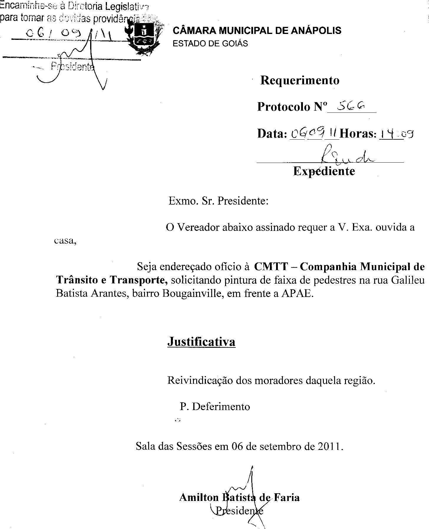 Ementa: O VEREADOR, ABAIXO ASSINADO REQUER A V.EX° OUVIDA A CASA, SEJA ENCAMINHADO OFÍCIO À CMTT, SOLICITANDO PINTURA DE FAIXA DE PEDESTRE NA RUA GALILEU BATISTA ARANTES, BAIRRO BOUGANVILLE, EM FRENTE A APAE.