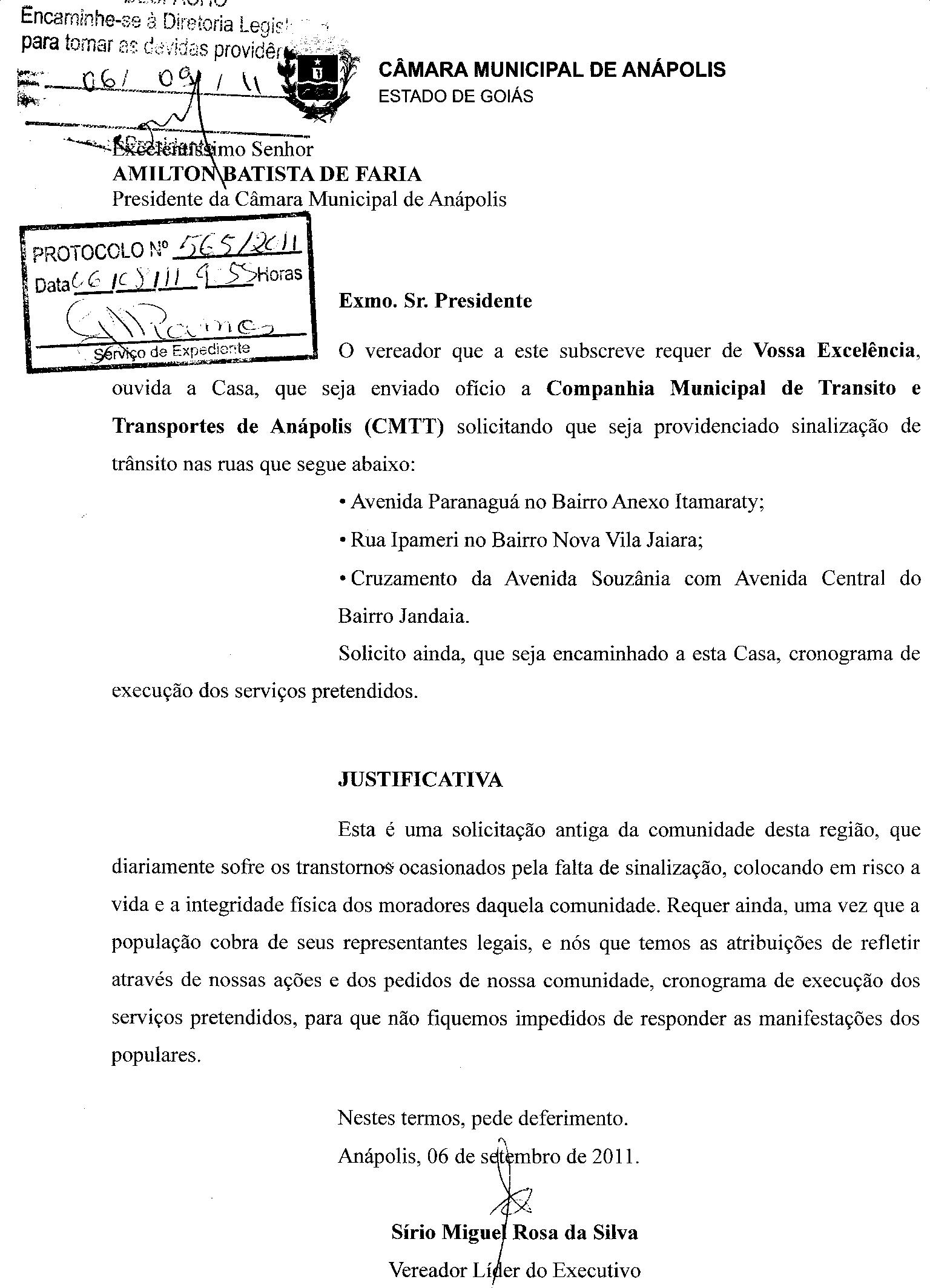 Ementa: O VEREADOR QUE A ESTE SUBSCREVE REQUER DE VOSSA EXELÊNCIA OUVIDA A CASA, QUE SEJA ENVIADO OFÍCIO A COMPANHIA MUNICIPAL DE TRANSITO E TRANSPORTE DE ANÁPOLIS (CMTT) SOLICITANDO QUE SEJA PROVIDENCIADO SINALIZAÇÃO DE TRANSITO NAS RUAS QUE SEGUE ABAIXO: -AVENIDA PARANAGUÁ NO BAIRRO ANEXO ITAMARATY; -RUA IPÁMERINO BAIRRO NOVA VILA JAIARA; -CRUZAMENTO DA AVENIDA SOUZANIA COM AVENIDA CENTRAL DO BAIRRO JANDAIA. SOLICITANDO AINDA, QUE SEJA ENCAMINHADA A ESTA CASA, CRONOGRAMA DE EXECUÇÃO DOS SERVIÇOS PRETENDIDOS.