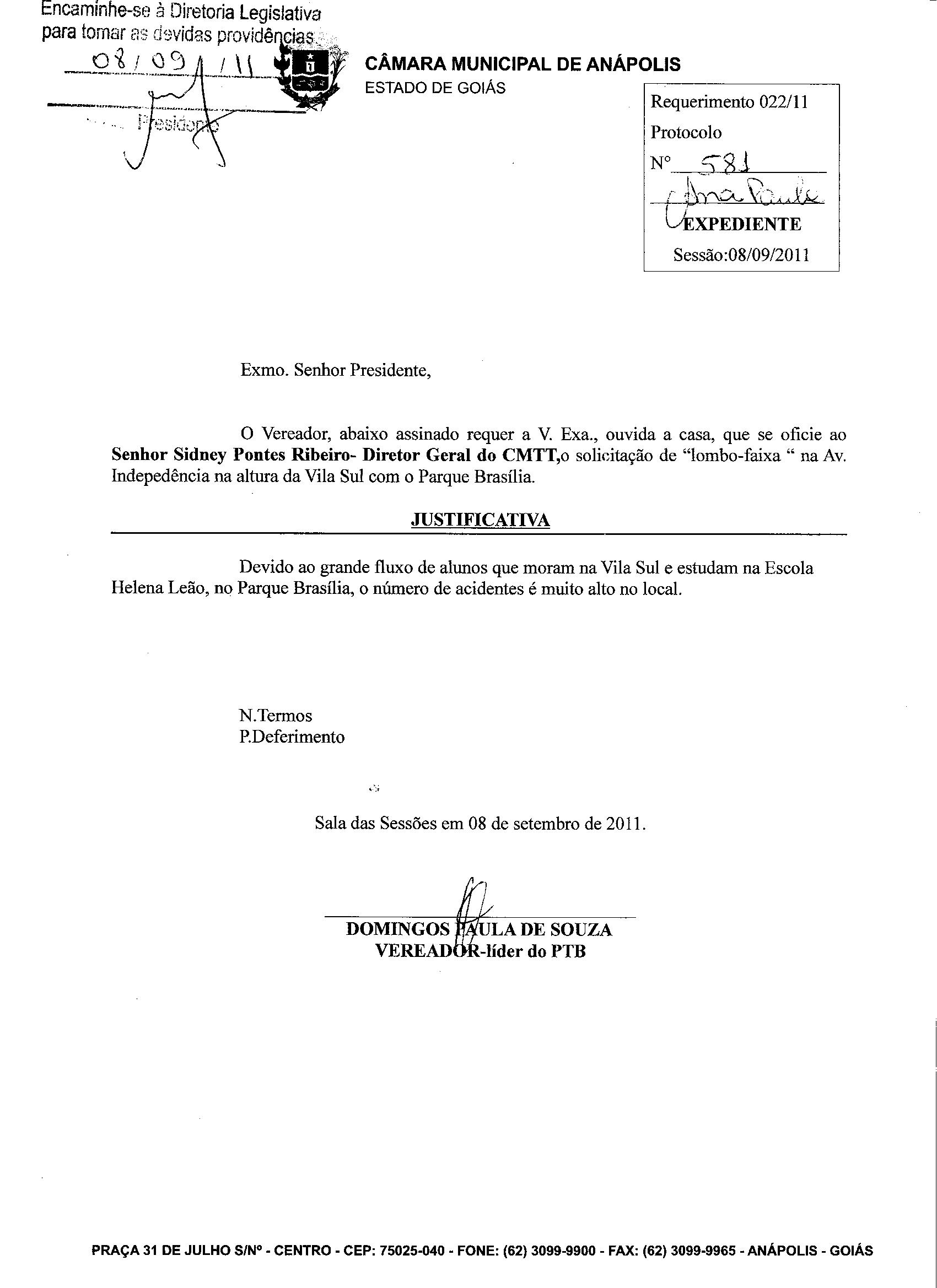 Ementa: O VEREADOR ABAIXO ASSINADO REQUER A V.EXA., OUVIDA A CASA QUE SE OFICIE AO SENHOR SIDNEY PONTES RIBEIRO- DIRETOR GERAL DO CMTT, O SOLICITAÇÃO DE "LOMBO-FAIXA" NA AV. INDEPÊNDENCIA NA ALTURA DA VILA SUL COM PARQUE BRASILIA.