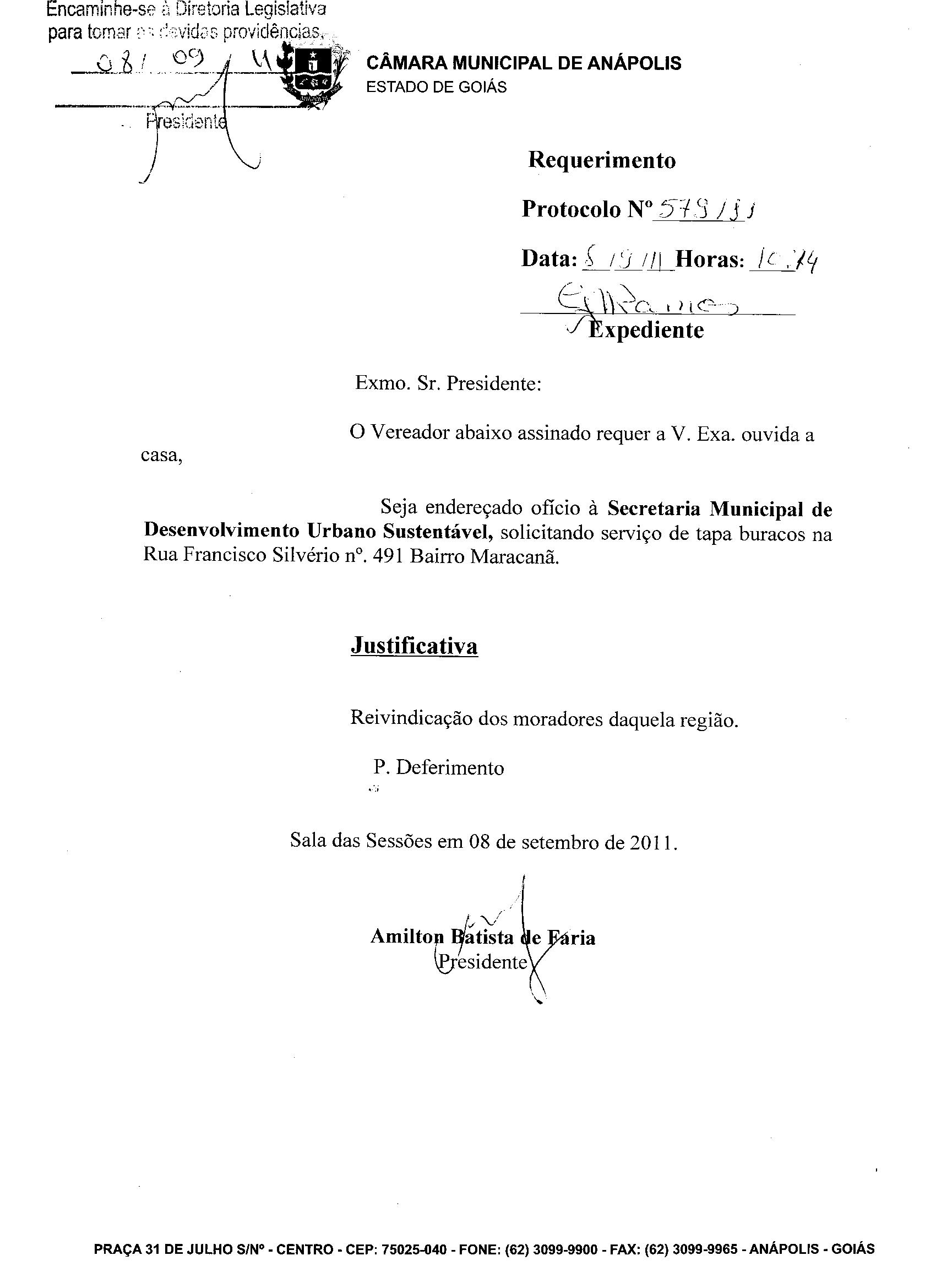 Ementa: O VEREADOR ABAIXO ASSINADO REQUER A V.EXA., OUVIDO A CASA, SEJA ENDEREÇADO OFÍCIO À SECRETARIA MUNICIPAL DE DESENVOLVIMENTO SUSTENTAVEL, SOLICITANDO SERVIÇO DE TAPA BURACOS NA RUA FRANSCISCO SILVERIO DE FARIA N° 491 BAIRRO MARACANÃ