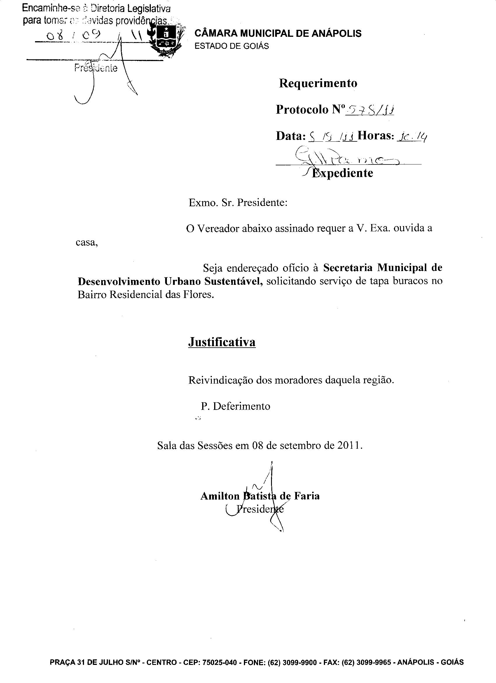 Ementa: O VEREADOR ABAIXO ASSINADO REQUER A V.EXA., OUVIDO A CASA, SEJA ENDEREÇADO OFÍCIO À SECRETARIA MUNICIPAL DE DESENVOLVIMENTO SUSTENTAVEL, SOLICITANDO SERVIÇO DE TAPA BURACOS NO BAIRRO RESIDENCIAL DAS FLORES