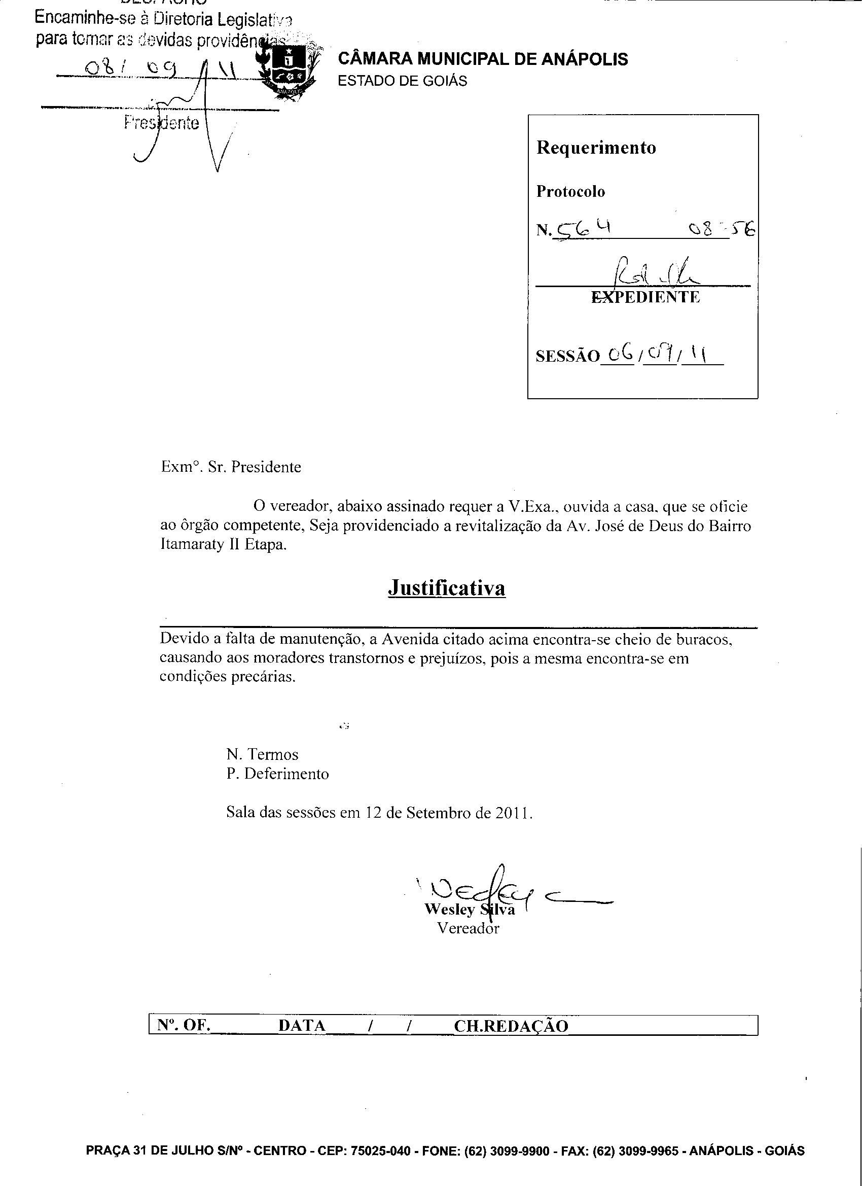 Ementa: O VEREADOR ABAIXO ASSINADO REQUER A V.EXA., OUVIDO A CASA, QUE SE OFÍCIE AO ÓRGÃO COMPETENTE, SEJA PROVIDENCIADO A REVITALIZAÇÃO DA AV JOSÉ DE DEUS DO BAIRRO ITAMARATY II ETAPA