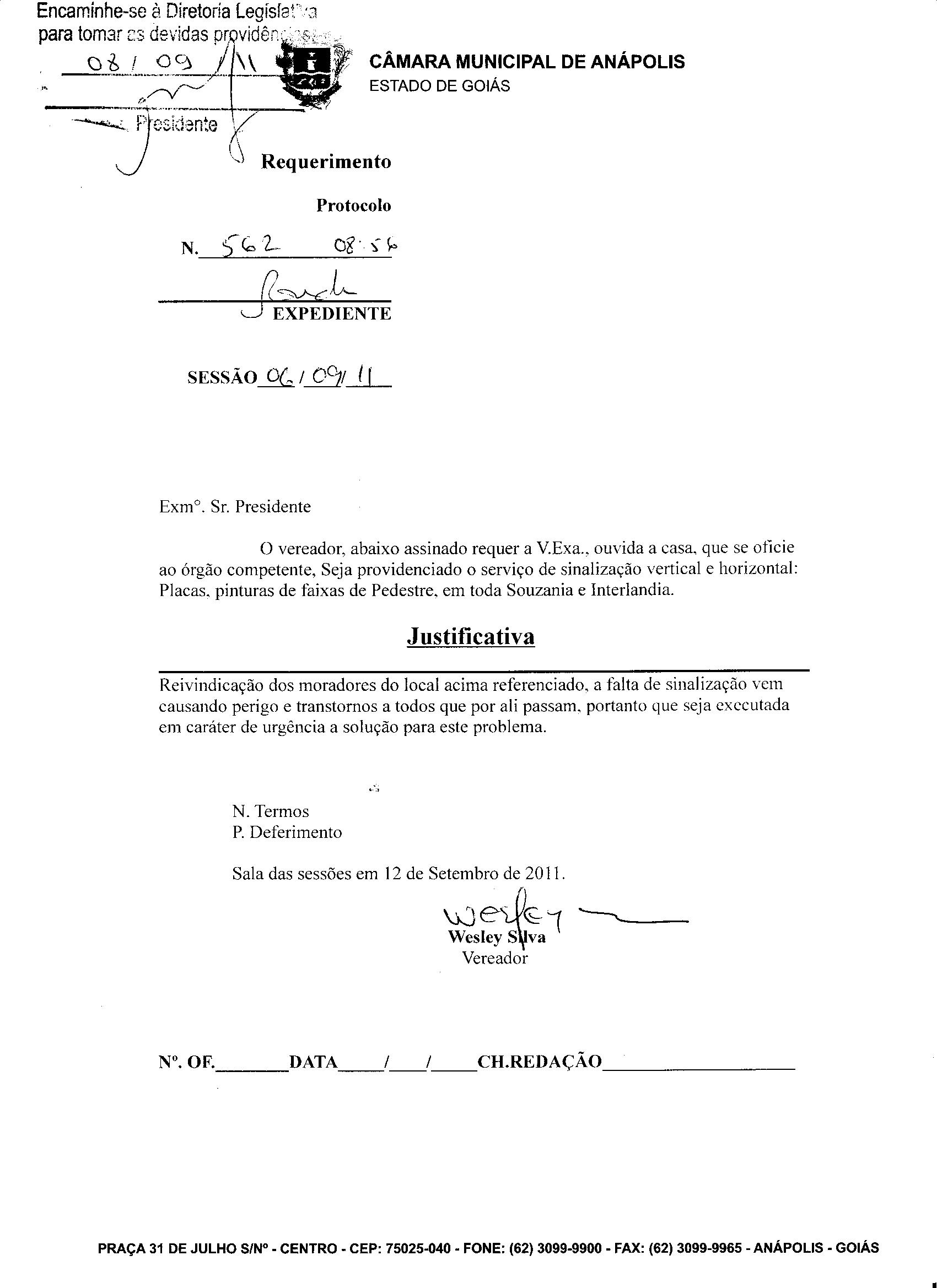 Ementa: O VEREADOR ABAIXO ASSINADO REQUER A V.EXA., OUVIDO A CASA, QUE SE OFÍCIE AO ÓRGÃO COMPETENTE, SEJA PROVIDENCIADO O SERVIÇO DE SINALIZAÇÃO VERTICAL E HORIZONTAL, PLACAS, PINTURAS DE FAIXAS DE PEDESTRE, EM TODA SOUZANIA E INTERLANDIA.