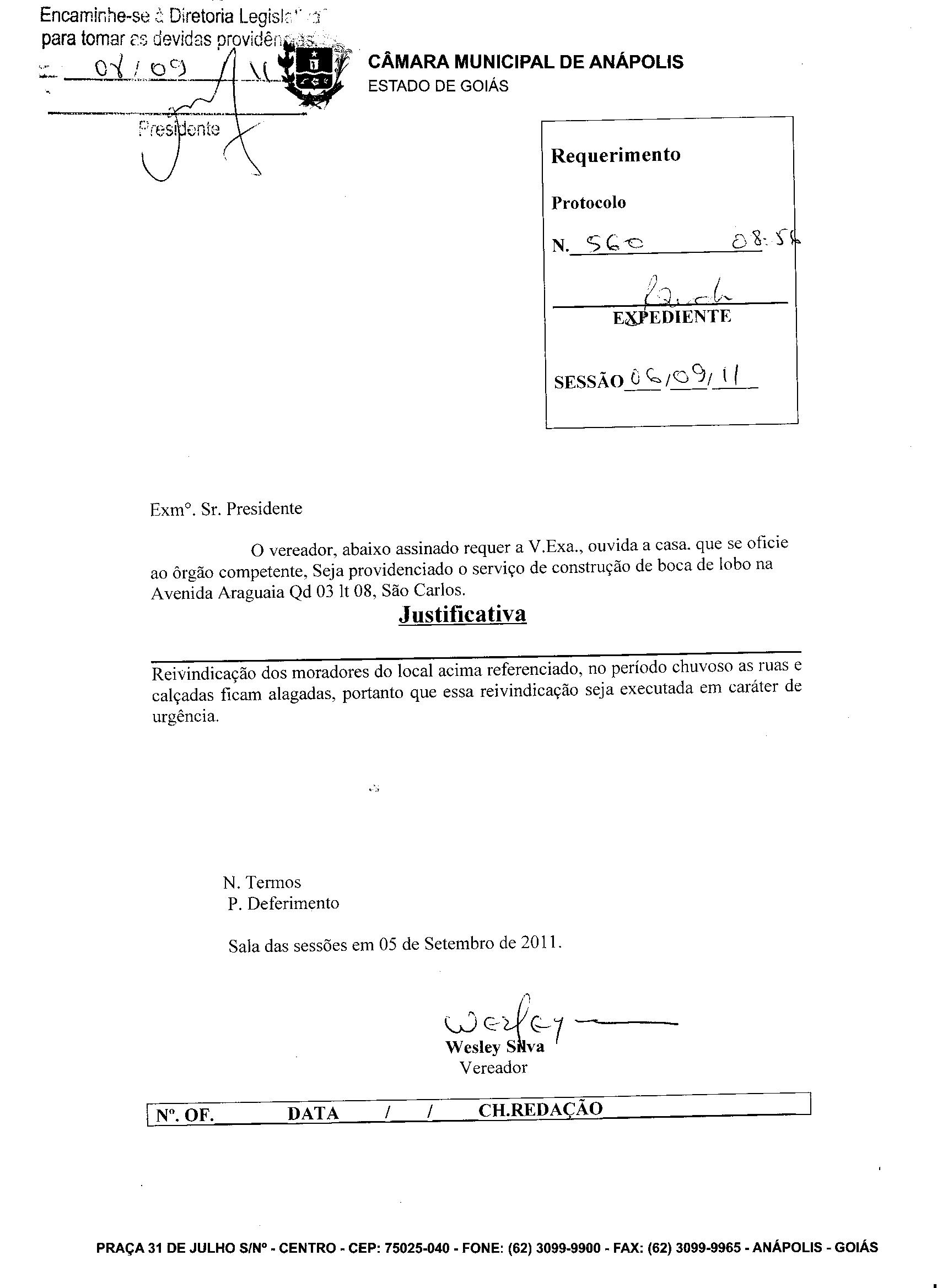 Ementa: O VEREADOR ABAIXO ASSINADO REQUER A V.EXA., OUVIDO A CASA, QUE SE OFÍCIE AO ÓRGÃO COMPETENTE, SEJA PROVIDENCIADO O SERVIÇO DE CONSTRUÇÃO DE BOCA DE LOBO NA AVENIDA ARAGUAIA QD 03 LT 08, SÃO CARLOS