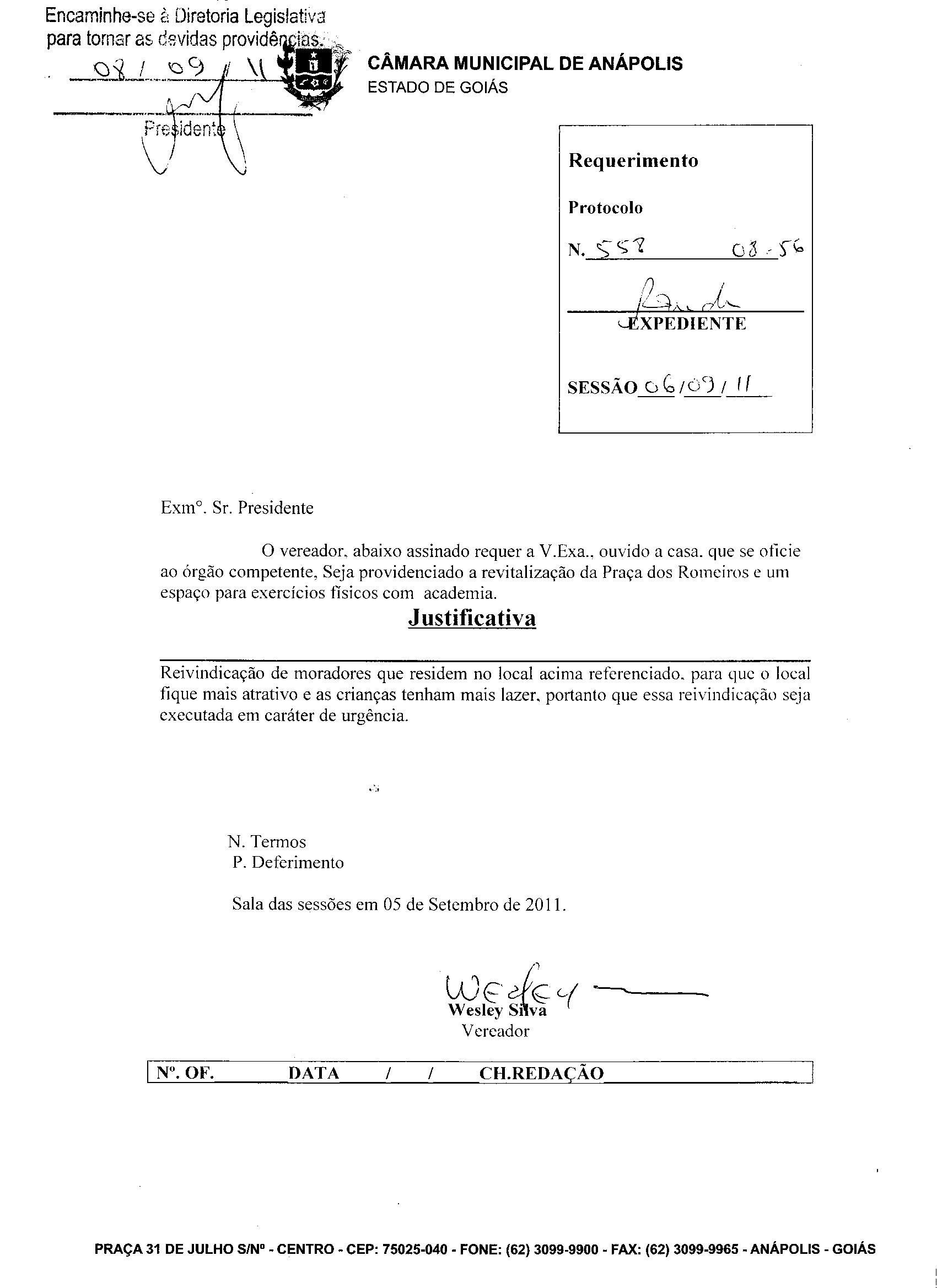 Ementa: O VEREADOR ABAIXO ASSINADO REQUER A V.EXA., OUVIDO A CASA, QUE SE OFÍCIE AO ÓRGÃO COMPETENTE, SEJA PROVIDENCIADO A REVITALIZAÇÃO DA PRAÇA DOS ROMEIROS E UM ESPAÇO PARA EXERCICIOS FÍSICOS COM ACADEMIA.