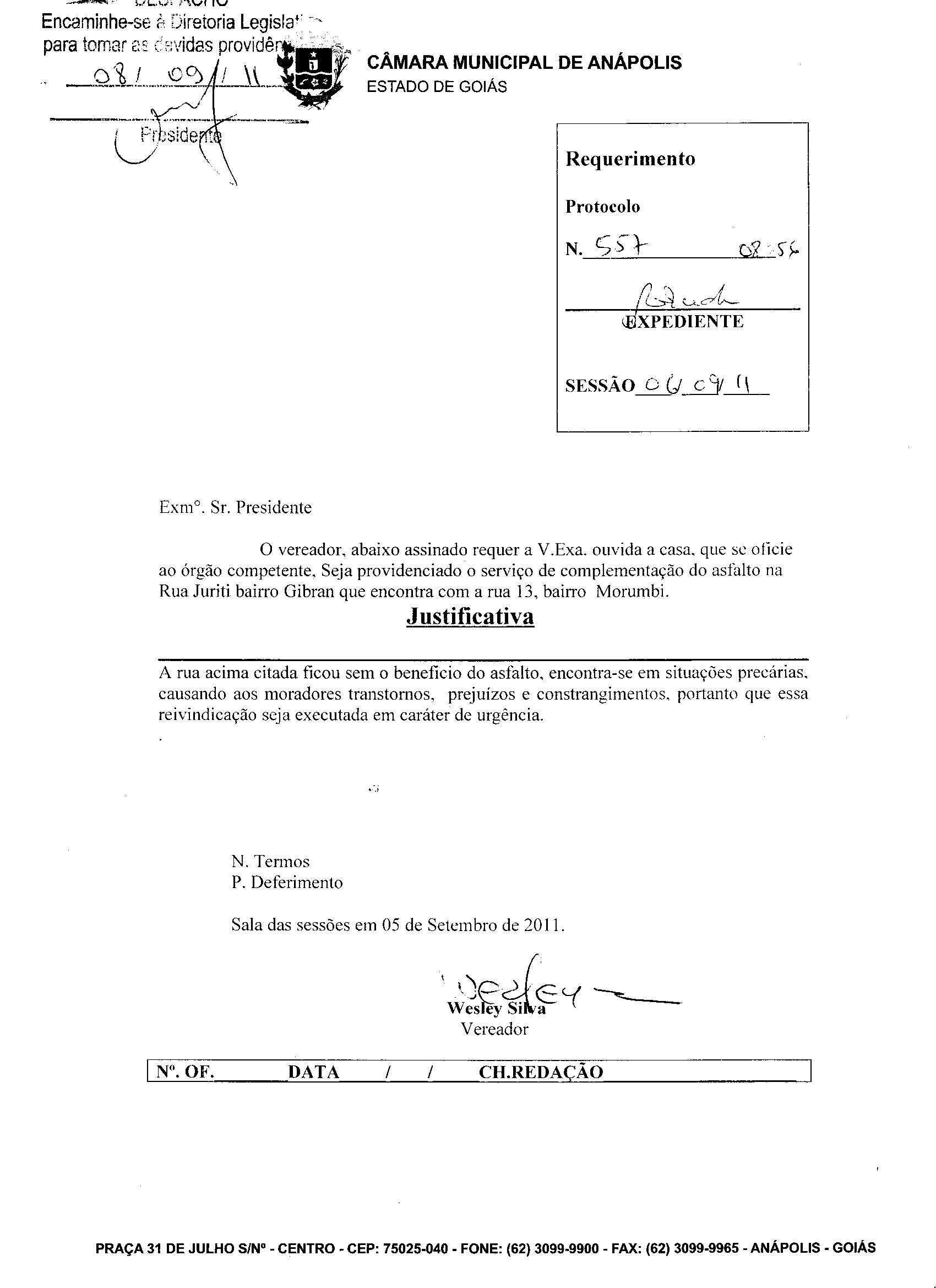 Ementa: O VEREADOR ABAIXO ASSINADO REQUER A V.EXA., OUVIDO A CASA, QUE SE OFÍCIE AO ÓRGÃO COMPETENTE, SEJA PROVIDENCIADO O SERVIÇO DE COMPLEMENTAÇÃO DO ASFALTO NA RUA JURITI BAIRRO GIBRAN QUE ENCONTRA COM A RUA 13 BAIRRO MORUMBI.
