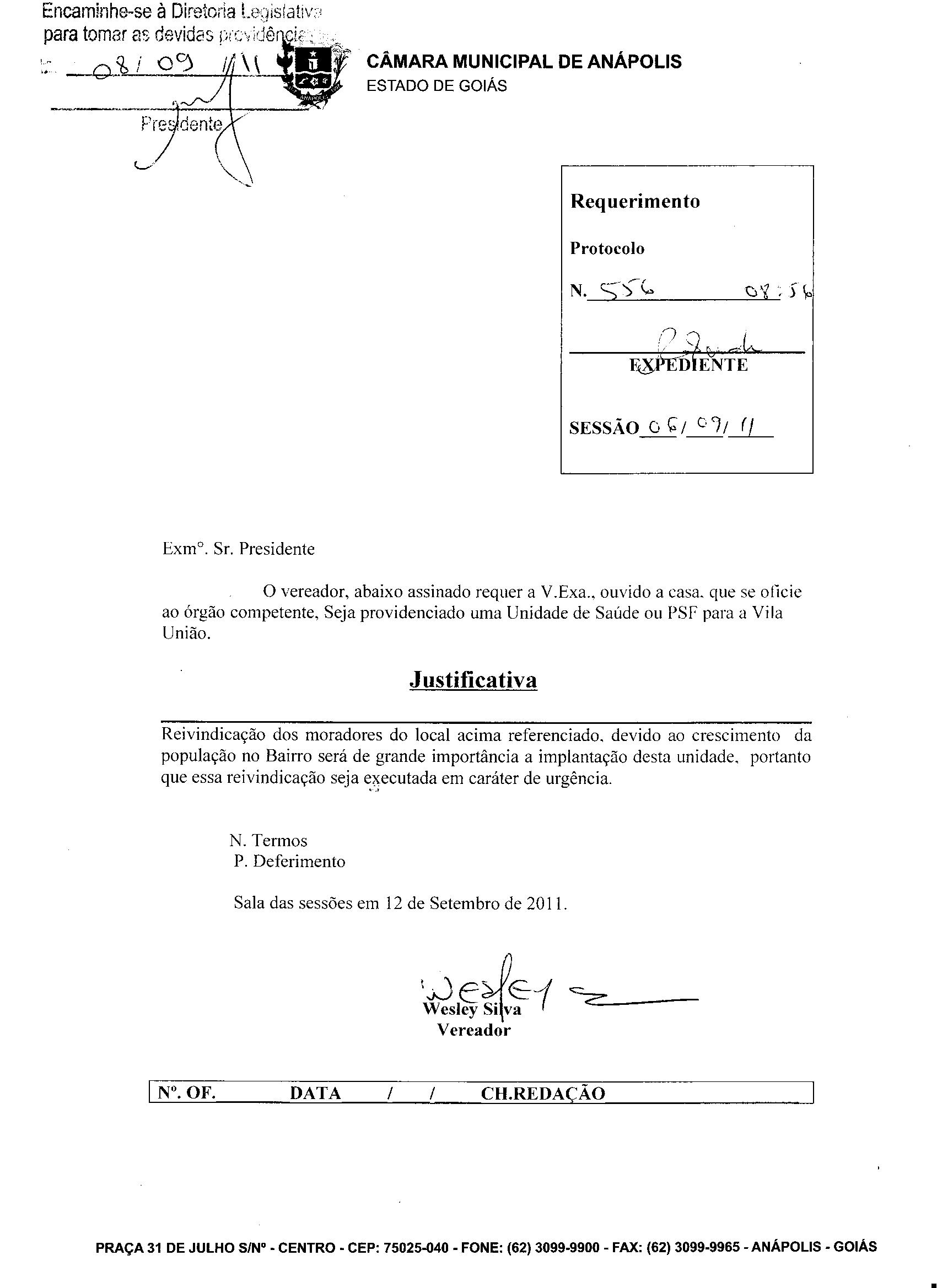 Ementa: O VEREADOR ABAIXO ASSINADO REQUER A V.EXA., OUVIDO A CASA, QUE SE OFÍCIE AO ÓRGÃO COMPETENTE, SEJA PROVIDENCIADO UMA UNIDADE DE SAÚDE OU PSF PARA A VILA UNIÃO