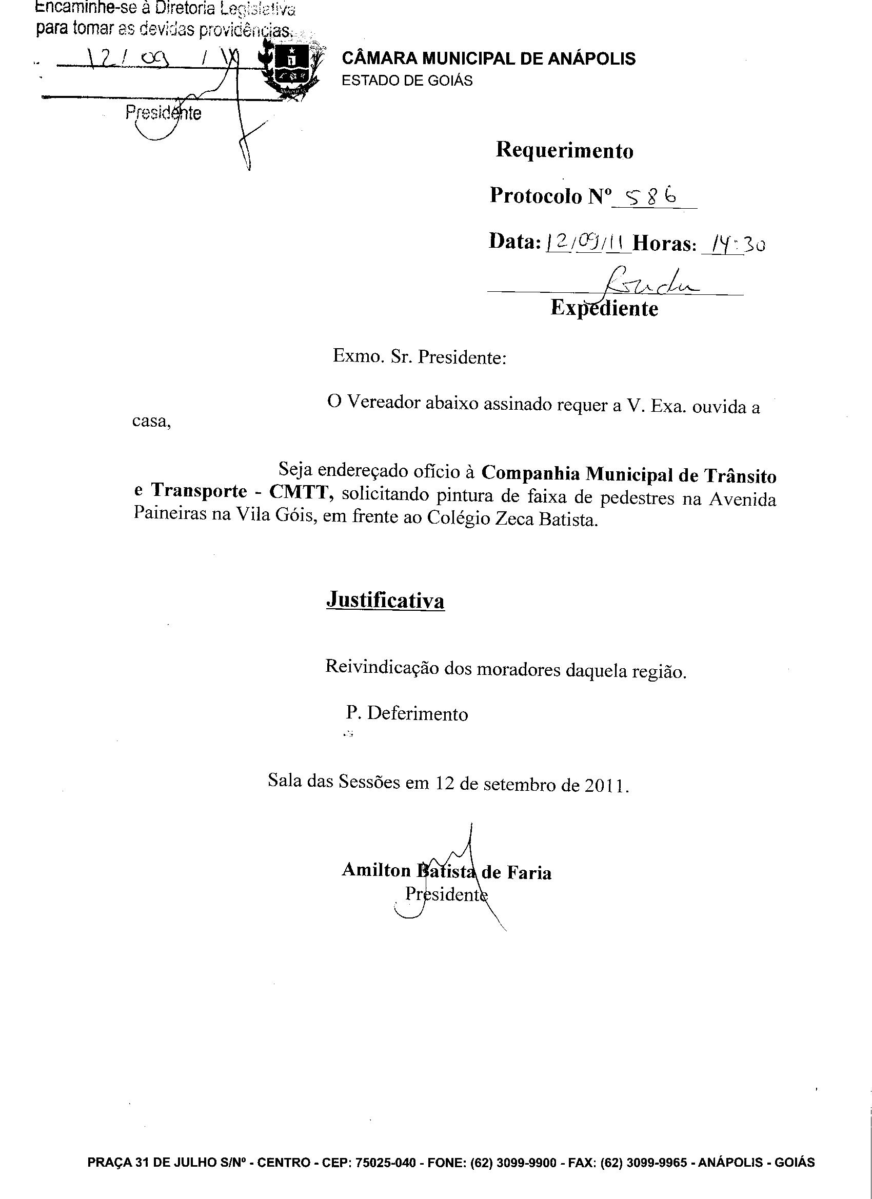 Ementa: O VEREADOR ABAIXO ASSINADO REQUER A V.EXA., OUVIDO A CASA, SEJA ENDEREÇADO OFICIO À CMTT, SOLICITANDO PINTURA DE FAIXA DE PEDESTRE NA AVENIDA UNIVERSSITARIA EM FRENTE AS FACULDADES UNI-EVANGELICA E ANHANGUERA