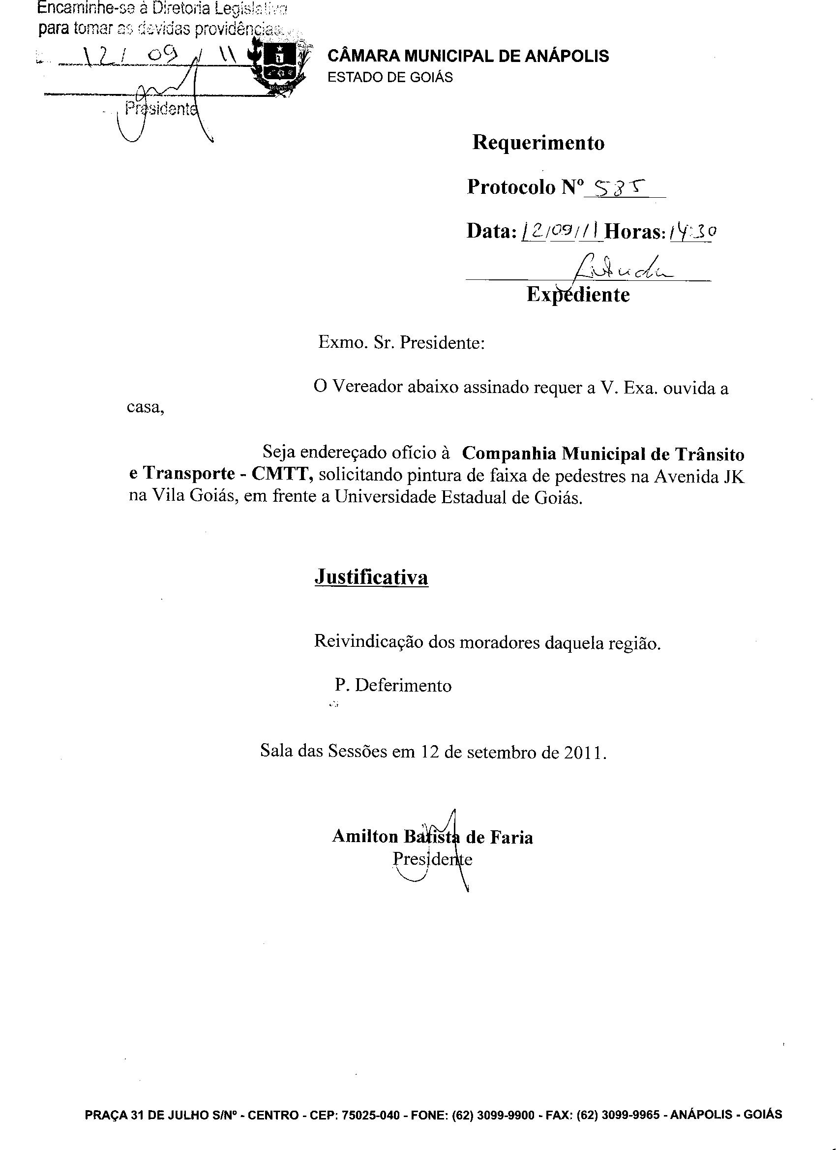 Ementa: O VEREADOR ABAIO ASSINADO REQUER A V.EXA, OUVIDA A CASA, SEJA ENDEREÇADO OFICIO À COMPANHIA MUNICIPAL DE TRÂNSITO E TRANSPORTE- CMTT, SOLICITANDO PINTURA DE FAIXA DE PEDESTRE NA AVENIDA JK NA VILA GOIÁS, EM FRENTE A UNIVERSIDADE ESTADUAL DE GOIÁS.