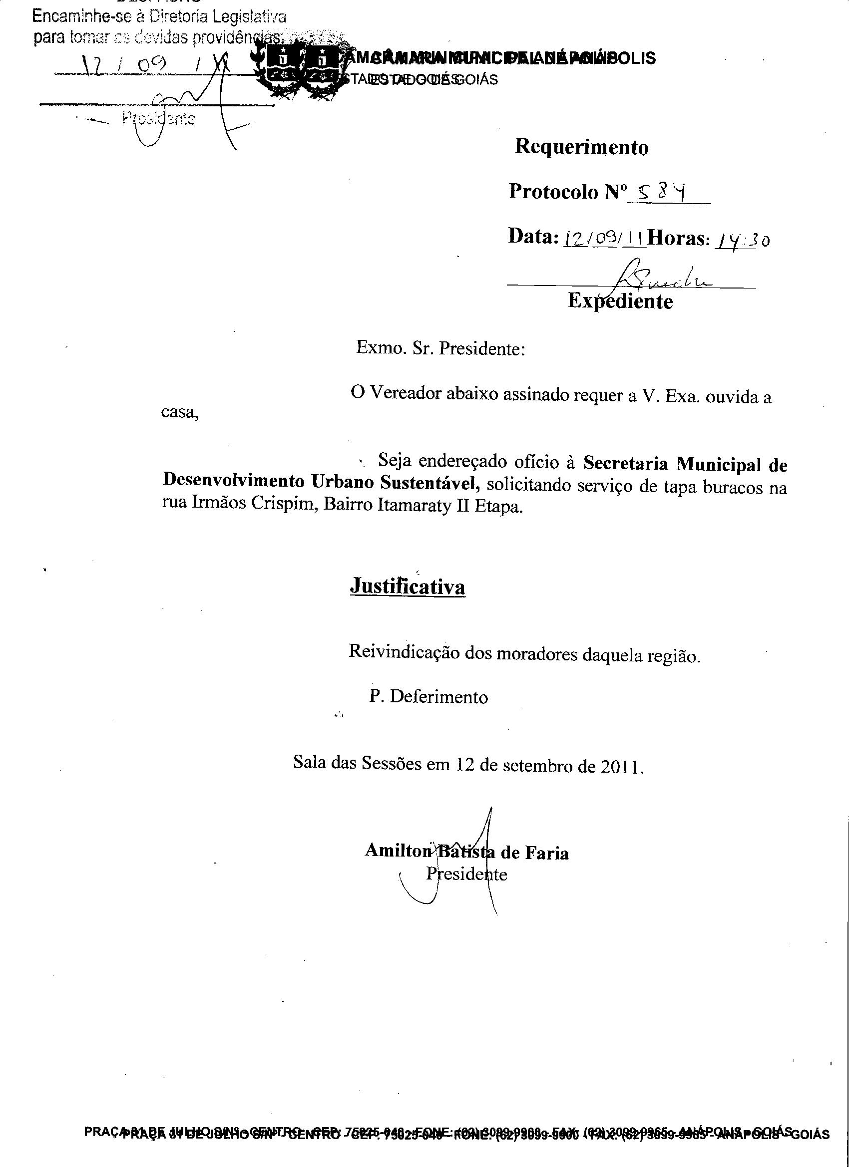 Ementa: O VEREADOR ABAIO ASSINADO REQUER A V.EXA, OUVIDA A CASA, SEJA ENDEREÇADO OFICIO À SECRETARIA MUNICIPAL DE DESENVOLVIMENTO URBANO SUSTENTÁVEL, SOLICITANDO SERVIÇO DE TAPA BURACOS NA RUA IRMÃOS CRISPIM, BAIRRO ITAMARATY II ETAPA