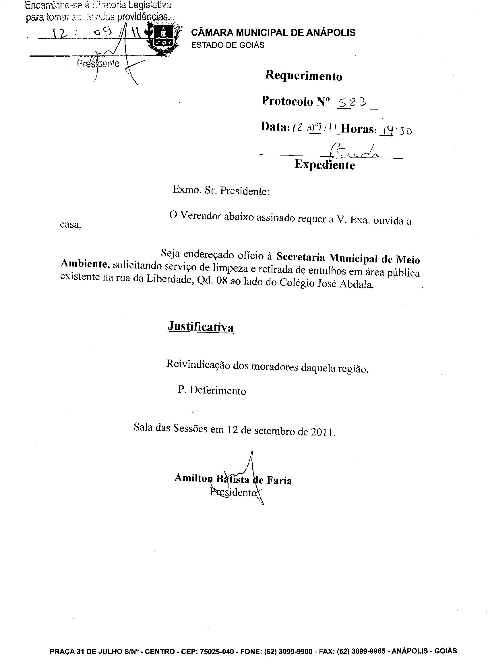 Ementa: O VEREADOR ABAIXO ASSINADO REQUER A V.EXA, OUVIDA A CASA, SEJA ENDEREÇADO OFICIO À SECRETARIA MUNICIPAL DE MEIO AMBIENTE, SOLICITANDO SERVIÇO DE LIMPEZA E RETIRADA DE ENTULHOS EM ÁREA PÚBLICA EXISTENTE NA RUA DA LIBERDADE, QD. 08 AO LADO DO COLEGIO JOSÉ ABDALA.