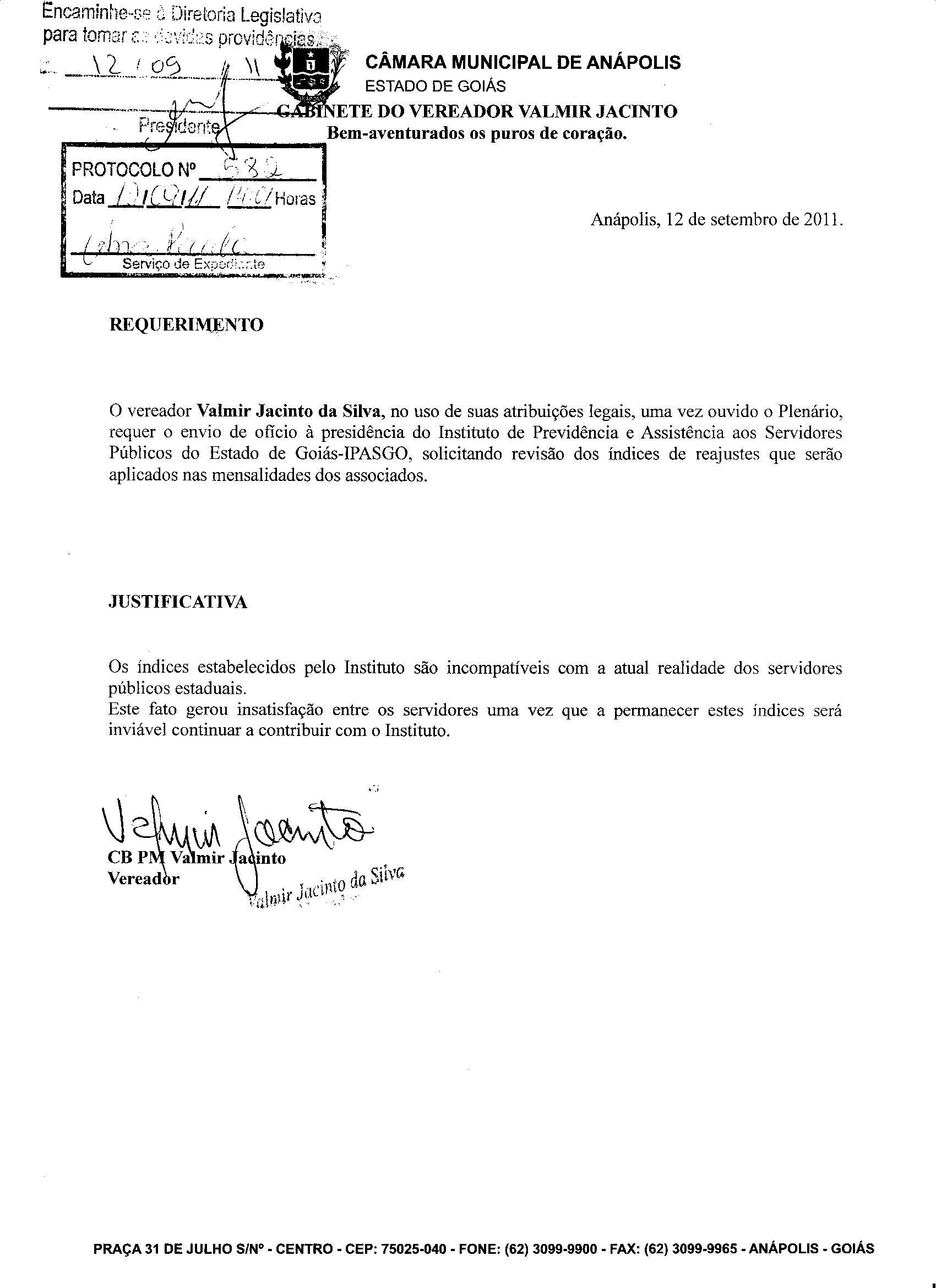 Ementa: O VEREADOR VALMIR JACINTO DA SILVA, NO USO DE SUAS ATRIBUIÇÕES LEGAIS, UMA VEZ OUVIDO O PLENÁRIO, REQUER O ENVIO DE OFICIO À PRESIDENCIA DO INSTITUTO DE PREVIDÊNCIA E ASSISTÊNCIA AOS SERVIDORES PÚBLICOS DO ESTADO DE GOIÁS-IPASGO, SOLICITANDO REVISÃO DOS INDICES DE REAJUSTES QUE SERÃO APLICADOS NAS MENSALIDADES DOS ASSOCIADOS.