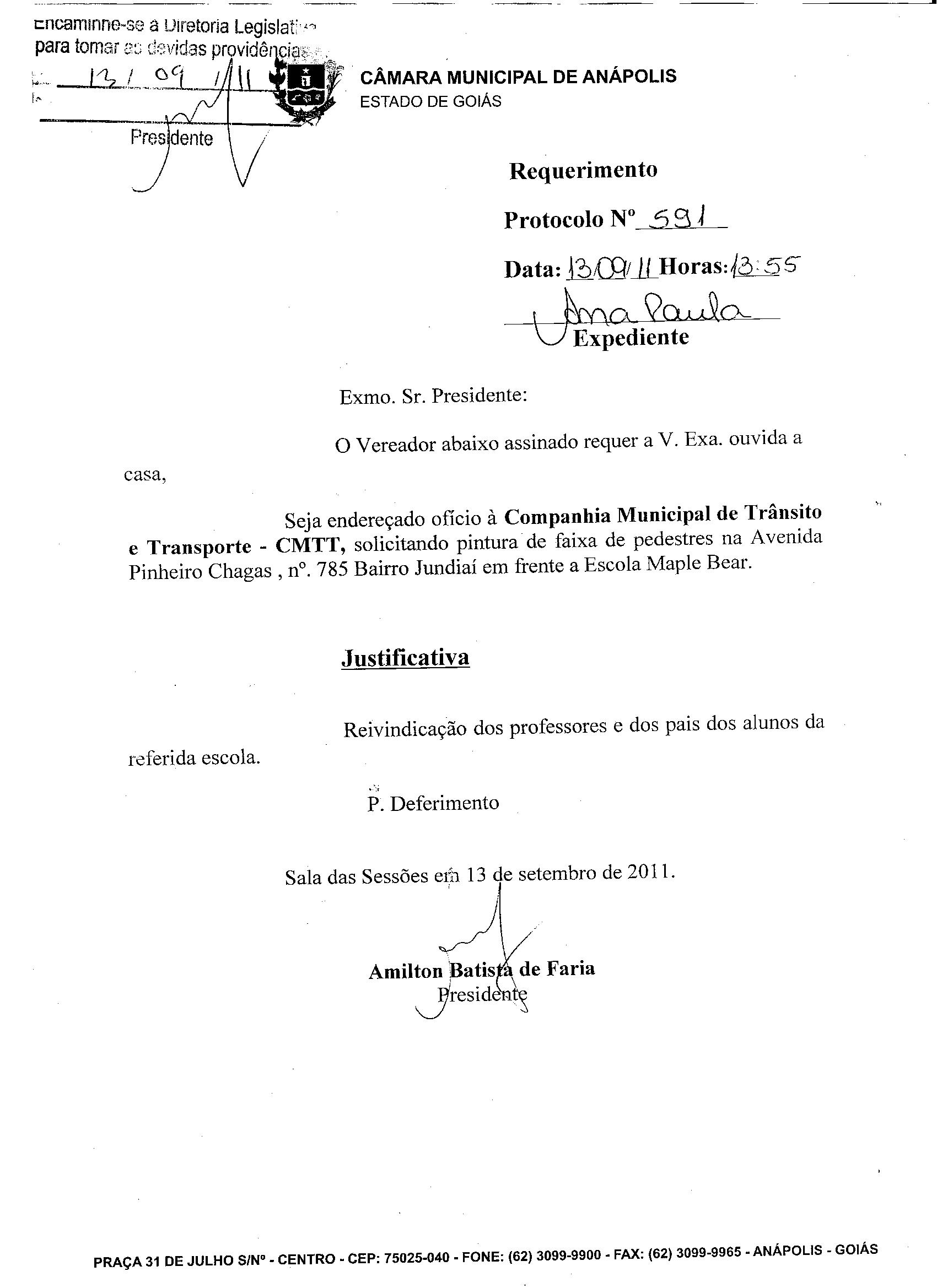 Ementa: O VEREADOR ABAIXO ASSINADO REQUER A V.EXª OUVIDA A CASA, QUE SEJA ENCAMINHADO OFÍCIO À COMPANHIA MUNICIPAL DE TRANSITO E TRANSPORTE- CMTT, SOLICITADO PINTURA DE FAIXA DE PEDESTRE NA AVENIDA PINHEIRO CHAGAS, Nº. 785 BAIRRO JUNDIAÍ EM FRENTE A ESCOLA MAPLE BEAR.