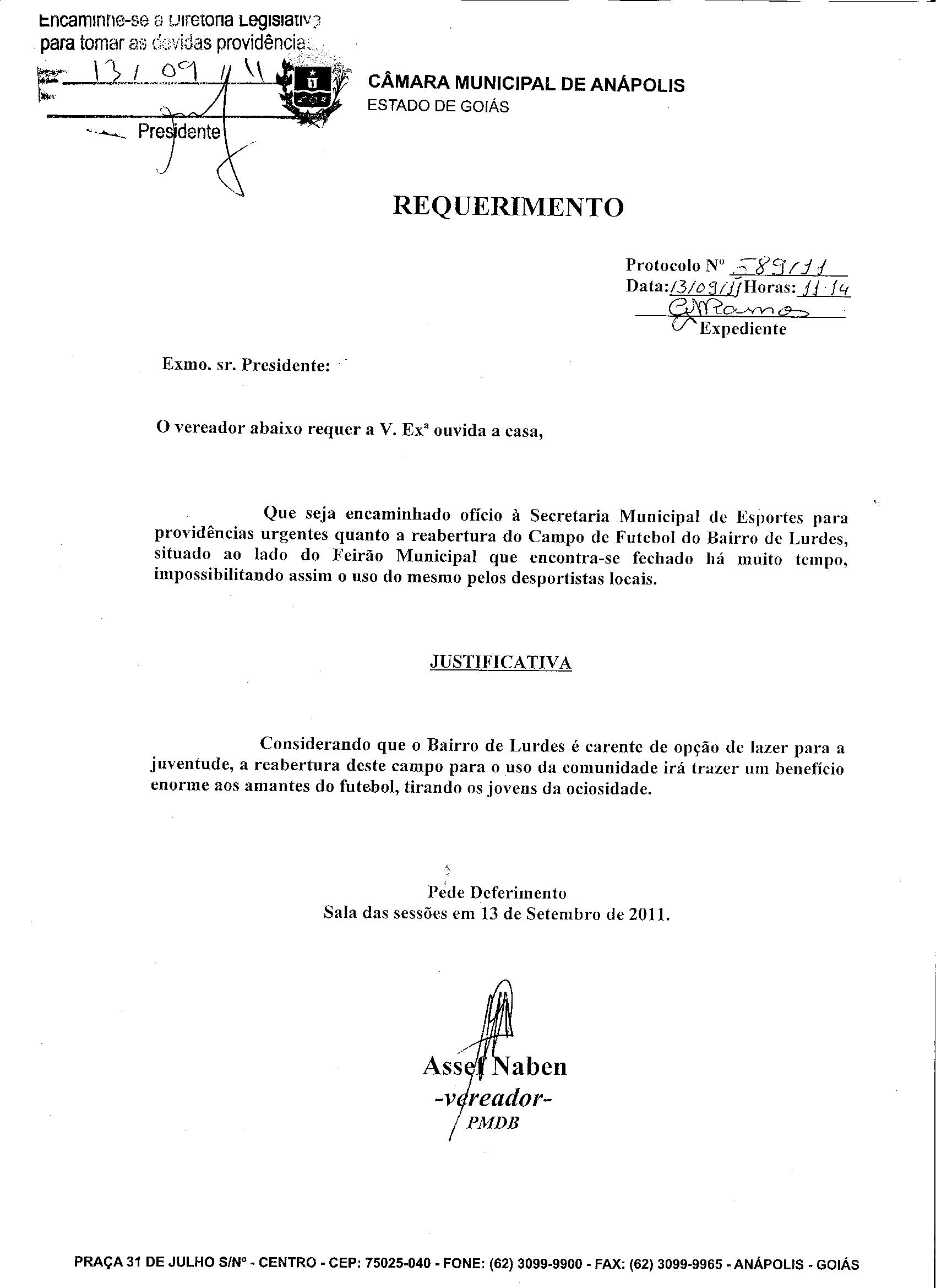 Ementa: O VEREADOR ABAIXO ASSINADO REQUER A V.EXª OUVIDA A CASA, QUE SEJA ENCAMINHADO OFÍCIO À SECRETARIA MUNICIPAL DE ESPORTE PARA PRÔVIDENCIAS URGENTES QUANTO A REABERTURADO CAMPO DE FUTEBOL DO BAIRRO DE LURDES, SITUADO AO LADO DO FEIRÃO MUNICIPAL QUE ENCONTRA-SE FECHADO HÁ MUITO TEMPO, IMPOSSIBILITANDO ASSIM O USO DO MESMO PELOS DESPORTISTAS LOCAIS.