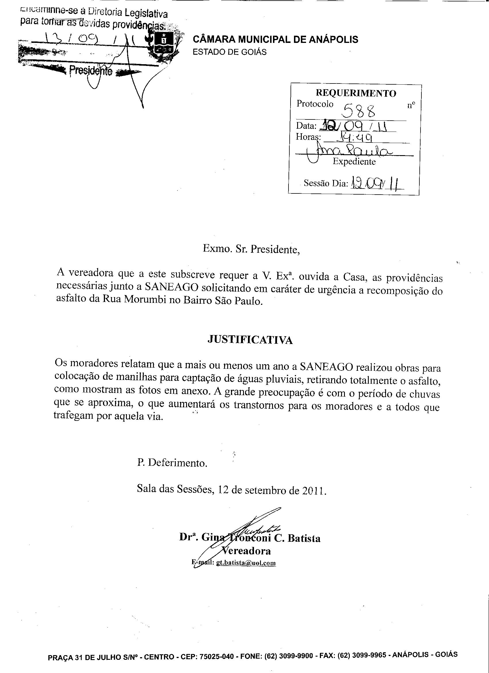 Ementa: A VEREADORA QUE A ESTE SUBSCREVE REQUER A V. EXª. OUVIDA A CASA, AS PROVIDENCIAS NECESSÁRIAS JUNTO A SANEAGO SOLICITADO EM CARÁTER DE URGENCIA A RECOMPOSIÇÃO DO ASFALTO DA RUA MORUMBI NA BAIRRO SÃO PAULO.
