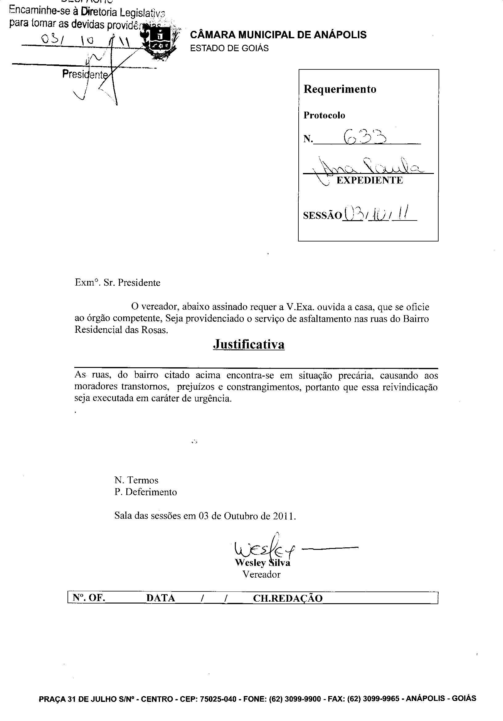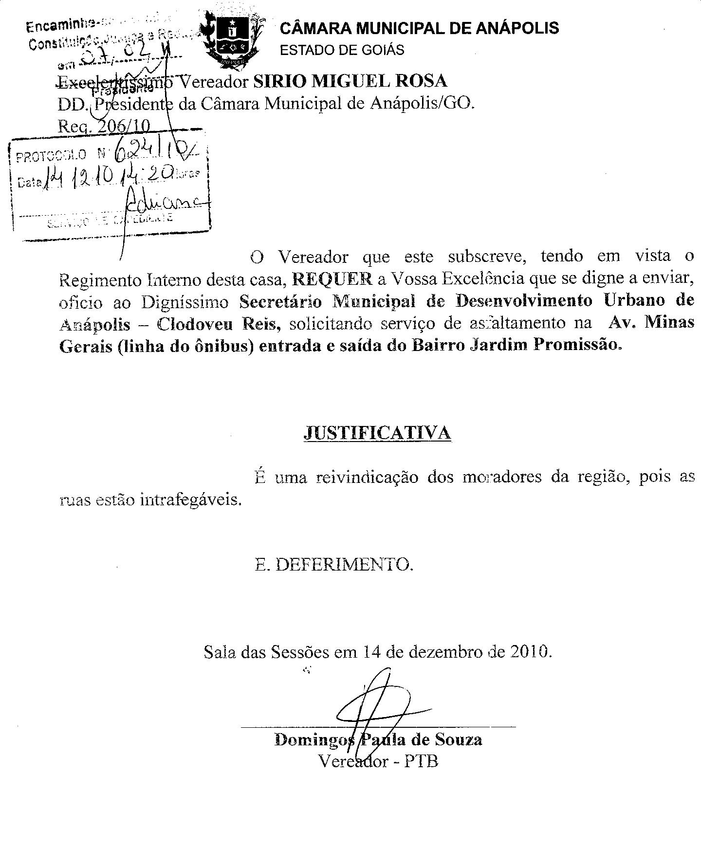 Ementa: O VEREDOR QUE ESTE SUBSCREVE, TENDO EM VISTA REGIMENTO INTERNO DESTA CASA, REQUER A VOSSA EXCELÊNCIA QUE SE DIGNE A ENVIAR, OFÍCIO AO DIGNÍSSIMO SECRETÁRIO MUNICIPAL DE DESENVOLVIMENTO URBANO DE ANÁPOLIS- CLODOVEU REIS, SOLICITANDO SERVIÇO DE ASFALTAMENTO NA AV. MINAS GERAIS(LINHA DO ÔNIBUS) ENTRADA E SAÍDA DO BAIRRO JARDIM PROMISSÃO