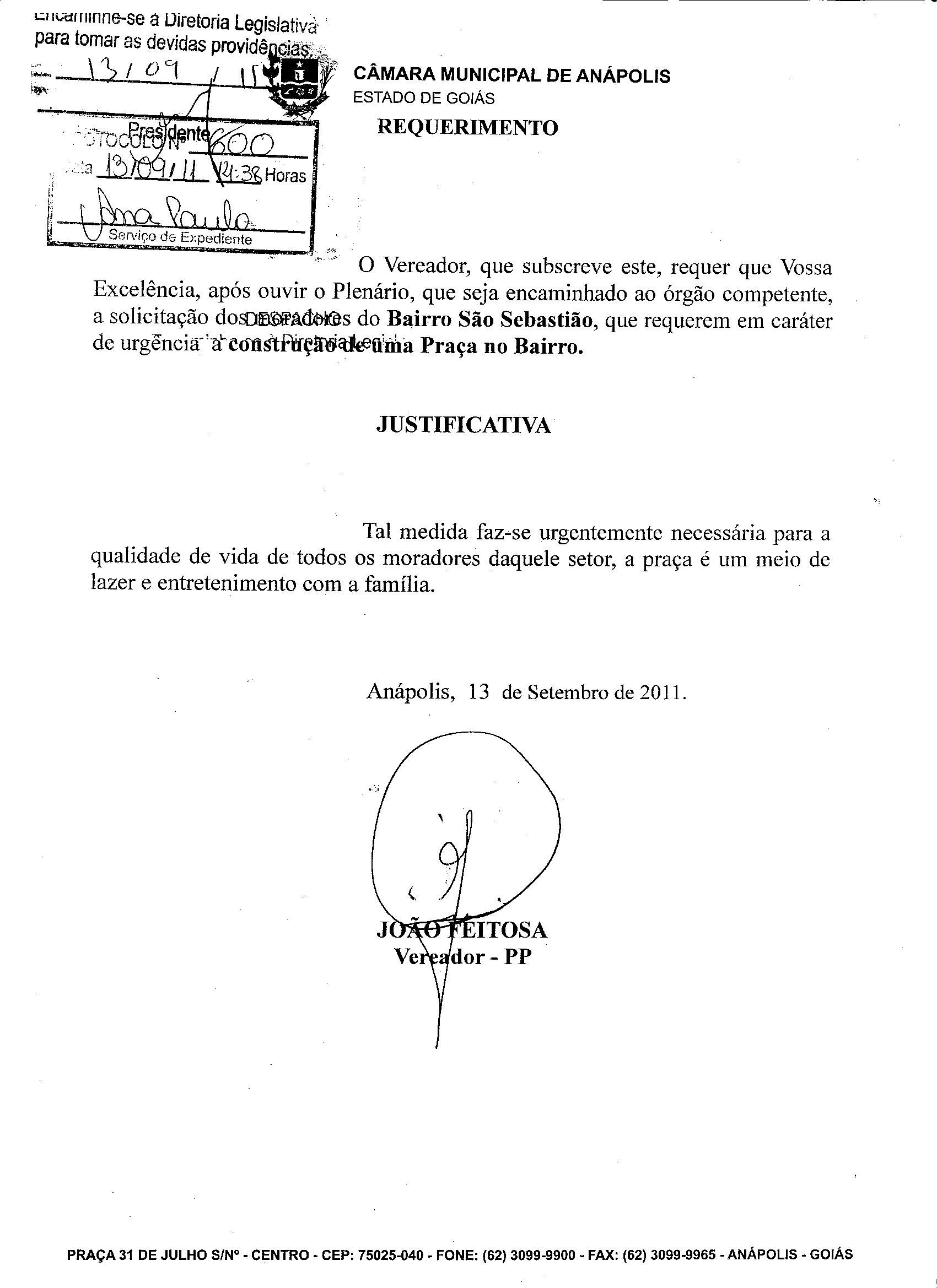 Ementa: O VEREADOR, QUE A ESTE, REQUER QUE VOSSA EXCELENCIA, APÓS OUVIR O PLENÁRIO, QUE SEJA ENCAMINHADO AO ÓRGÃO COMPETENTE, A SOLILCITAÇÃO DOS MORADORES DO BAIRRO SÃO SEBASTIÃO, QUE REQUEREM EM CARATER DE URGENCIA A CONSTRUÇÃO DE UMA PRAÇA NO BAIRRO.