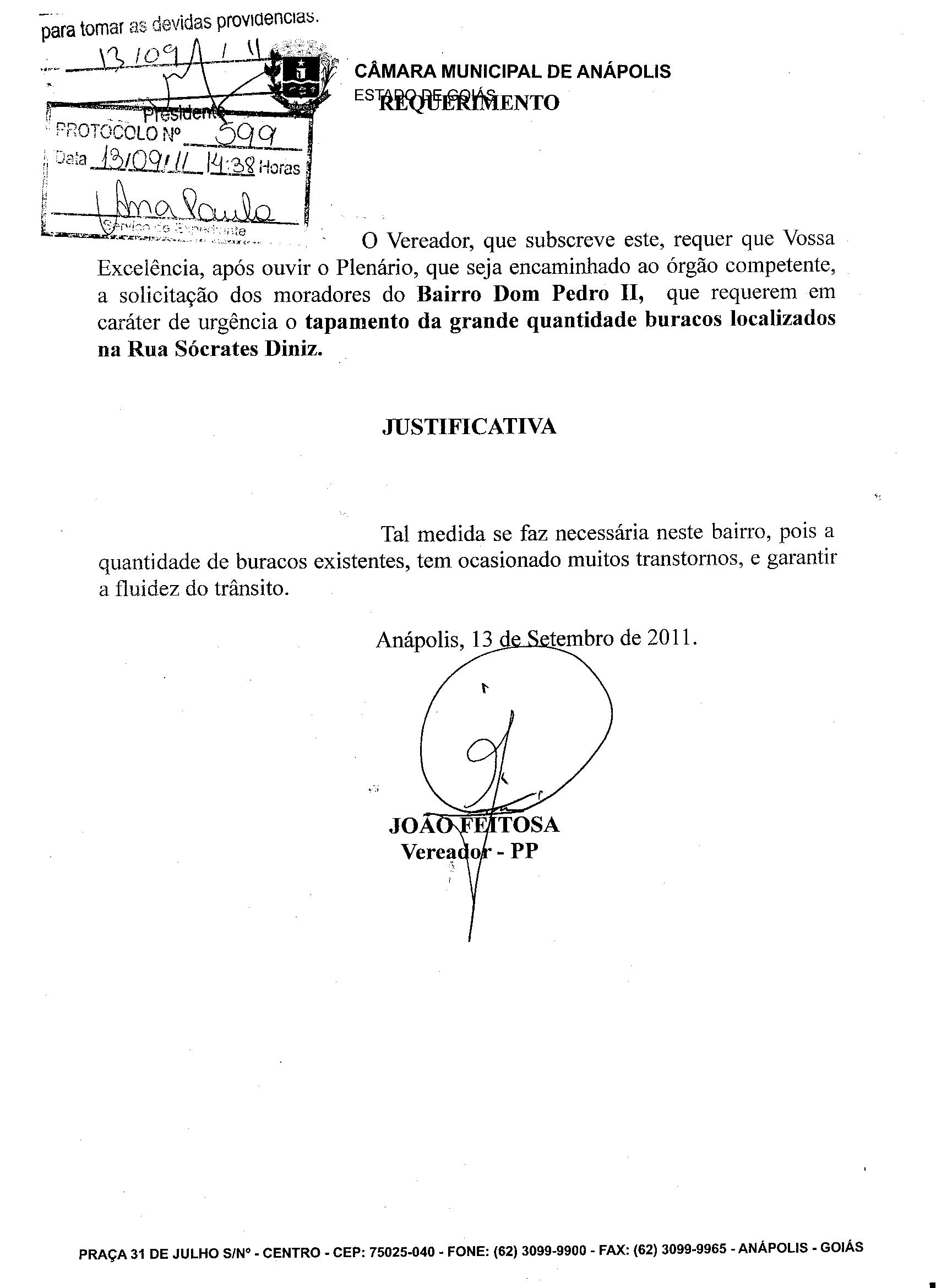 Ementa: O VEREADOR, QUE SUBSCREVE ESTE, REQUER QUE VOSSA EXCELÊNCIA, APÓS OUVIR O PLENÁRIO, QUE SEJA ENCAMINHADO AO ORGÃO COMPETENTE, A SOLICITAÇÃO DOS MORADORES DO BAIRRO DOM PEDRO II, QUE REQUEREM EM CARATER DE URGÊNCIA O TAPAMENTO DA GRANDE QUANTIDADE BURACOS LOCALIZADOS NA RUA SÓCRATES DINIZ.