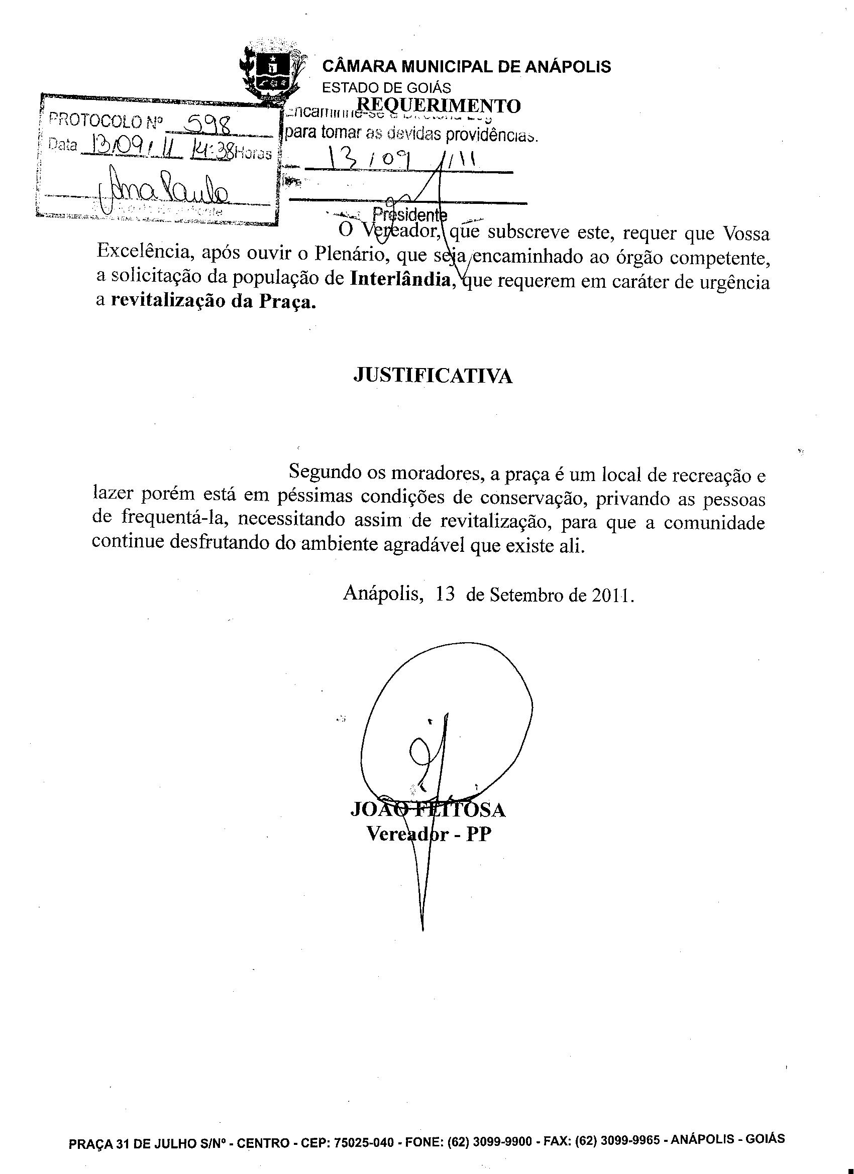 Ementa: O VEREADOR, QUE SUBSCREVE ESTE, REQUER QUE VOSSA EXCELÊNCIA, APÓS OUVIR O PLENÁRIO, QUE SEJA ENCAMINHADO AO ORGÃO COMPETENTE A SOLICITAÇÃO DA POPULAÇÃO DE INTERLÂNDIA, QUE REQUEREM EM CARATER DE URGÊNCIA A REVITALIZAÇÃO DA PRAÇA.