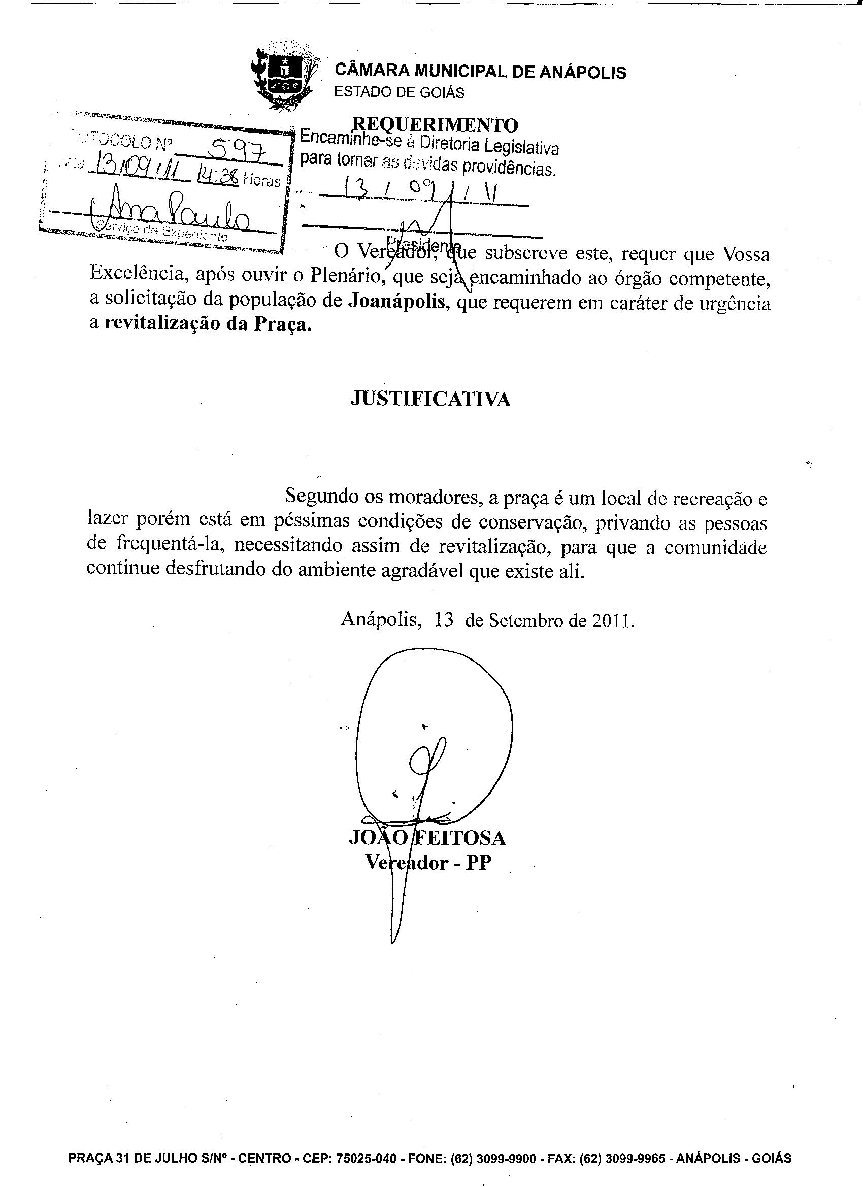 Ementa: O VEREADOR, QUE SUBSCREVE ESTE, REQUER QUE VOSSA EXCELÊNCIA, APÓS OUVIR O PLENÁRIO, QUE SEJA ENCAMINHADO AO ORGÃO COMPETENTE, A SOLICITAÇÃO DA POPULAÇÃO DE JOANÁPOLIS, QUE REQUEREM EM CARATER DE URGENCIA A REVITALIZAÇÃO DA PRAÇA.