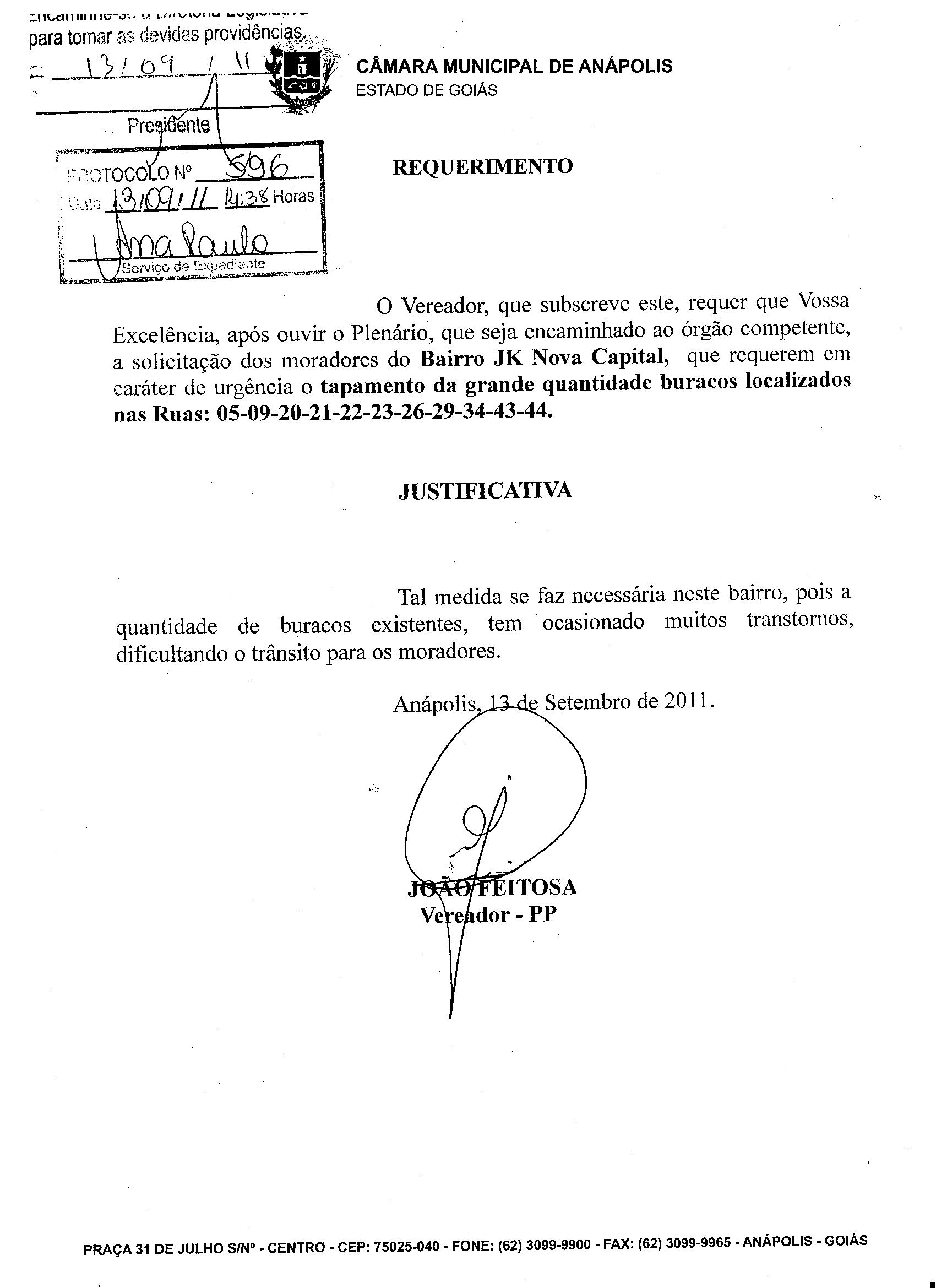 Ementa: O VEREADOR QUE SUBSCREVE ESTE, REQUER QUE VOSSA EXELÊNCIA, APÓS OUVIR O PLENÁRIO, QUE SEJA ENCAMINHADO AO ÔRGÃO COMPETENTE, A SOLICITAÇÃO DOS MORADORES DO BAIRRO JK NOVA CAPITAL, QUE REQUEREM EM CARATER DE URGÊNCIA O TAPAMENTO DA GRANDE QUANTIDADE DE BURACOS LOCALIZADOS NAS RUAS 05-09-20-21-22-23-26-29-34-43-44.