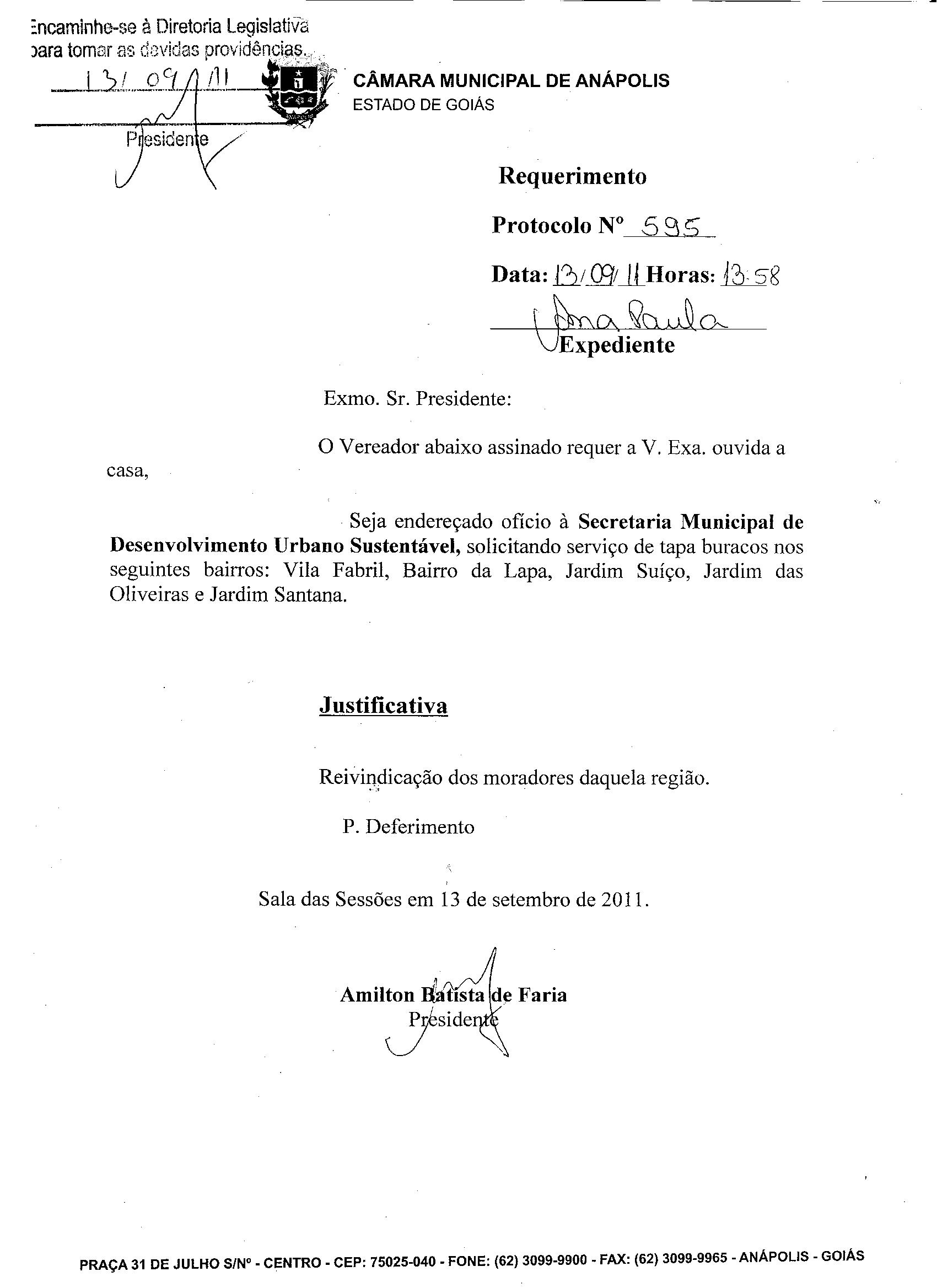 Ementa: O VEREADOR ABAIXO ASSINADO REQUER A V.EXª OUVIDA A CASA, QUE SEJA ENCAMINHADO OFÍCIO À SECRETARIA MUNICIPAL DE DESENVOLVIMENTGO URBANO SUSTENTAVEL, SOLICITANDO SERVIÇO DE TAPA BURACOS NOS SEGUINTES BAIRROS: VILA FABRIL, BAIRRO DA LAPA, JARDIM DAS OLIVEIRAS E JARDIM SANTANA. ACEITAR DEPOIMENTO.