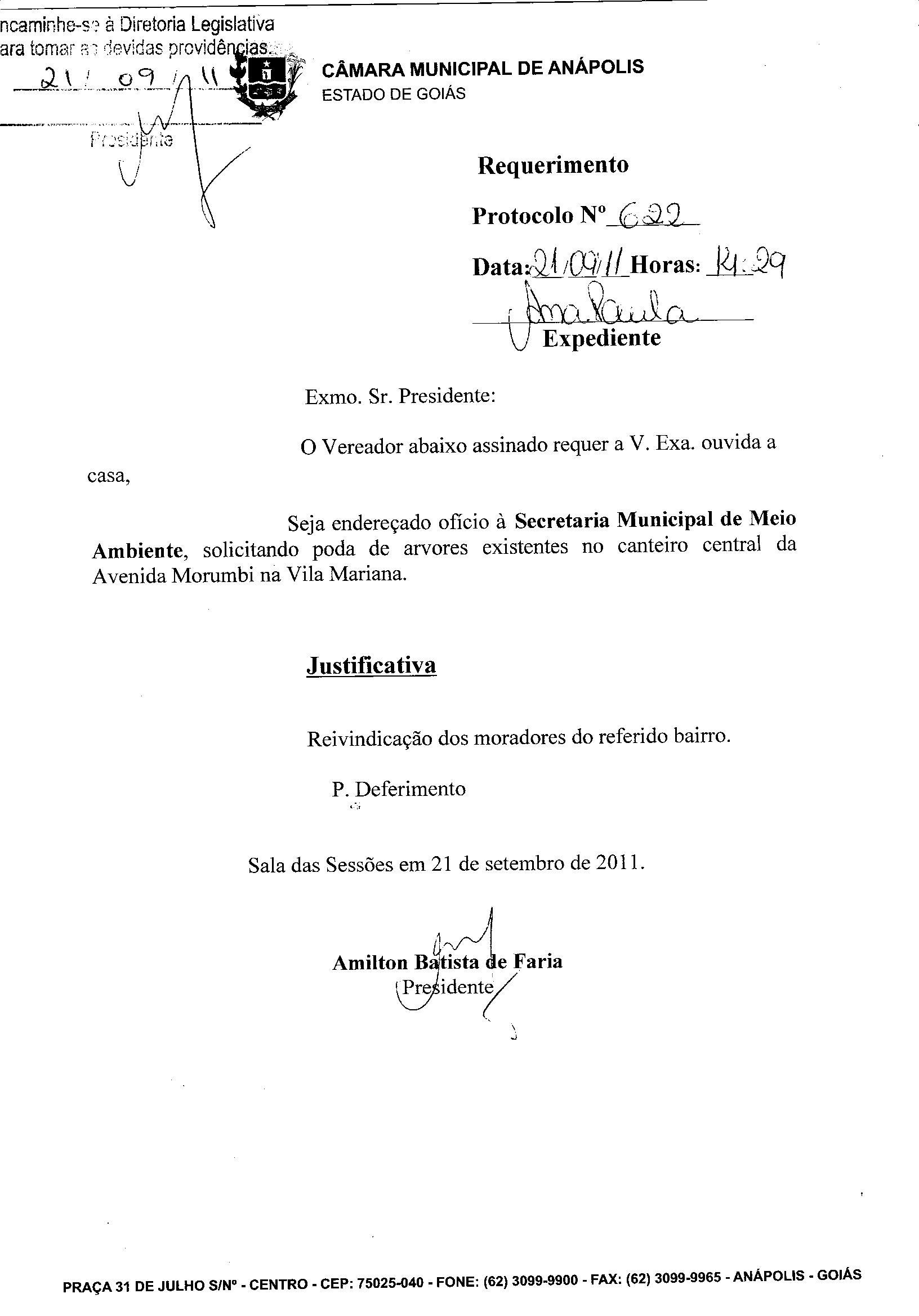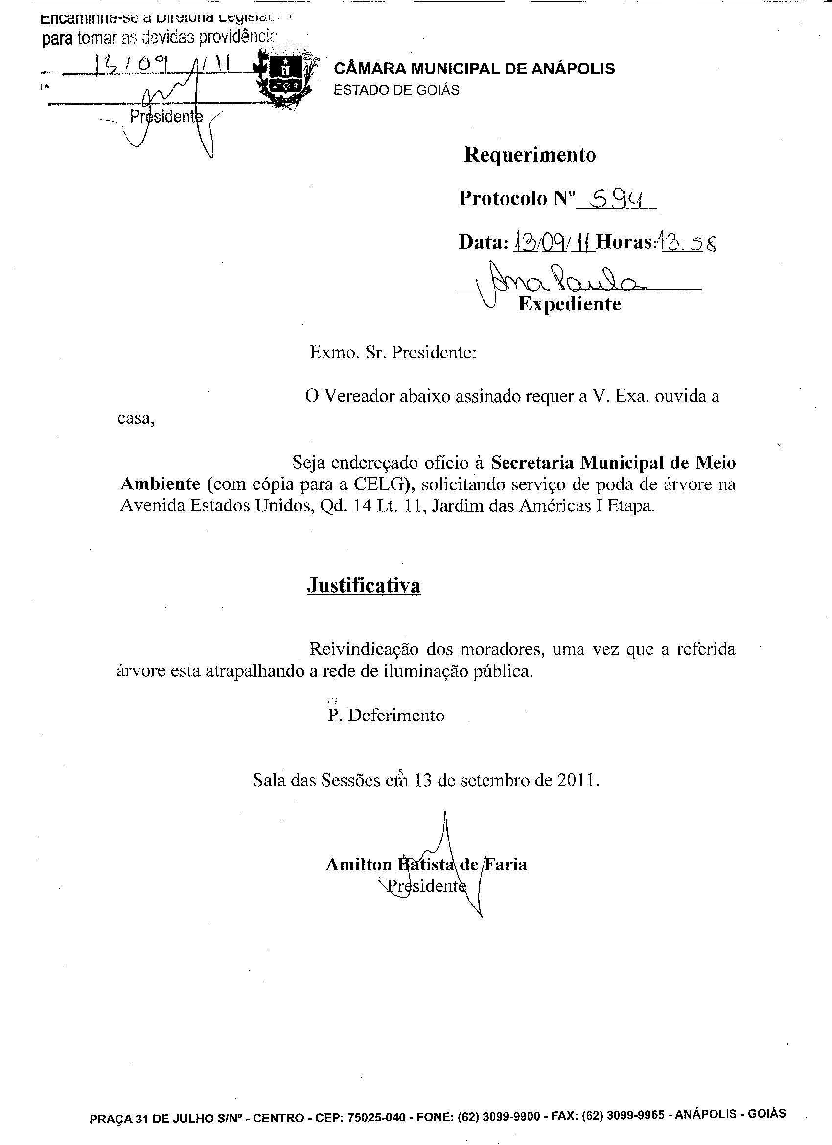 Ementa: O VEREADOR ABAIXO ASSINADO REQUER A V.EXª OUVIDA A CASA, QUE SEJA ENCAMINHADO OFÍCIO À SECRETARIA MUNICIPAL DE MEIO AMBIENTE (COM UMA CÓPIA PARA A CELG), SOLICITANDO SERVIÇO DE PODA DE ÁRVORE NA AVENIDA ESTADOS UNIDOS, QD. 14 LT. 11, JARDIM DAS AMÉRICAS I ETAPA.
