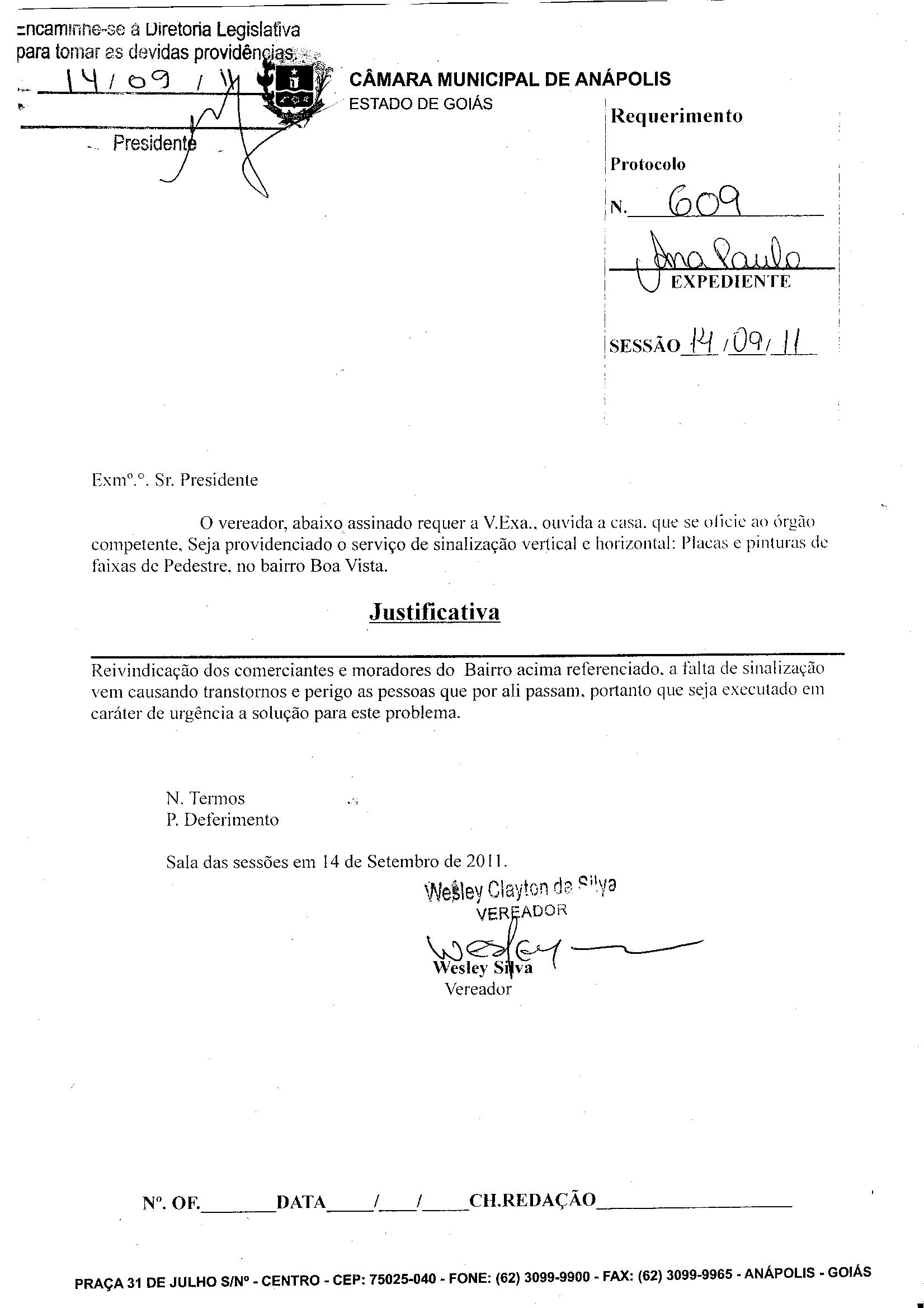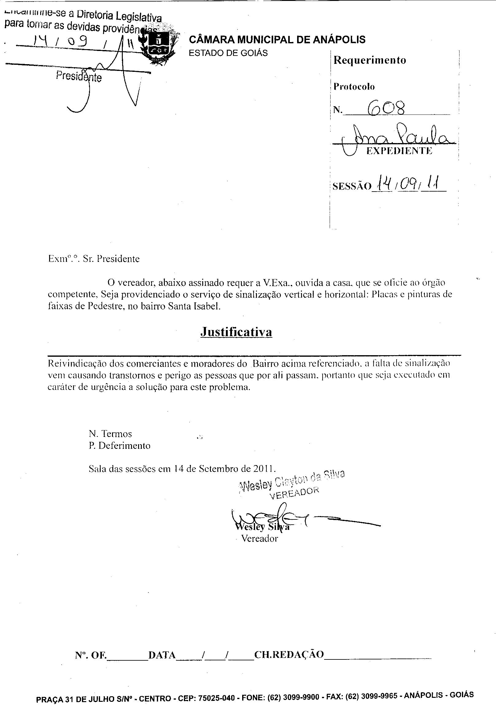 Ementa: O VEREADOR ABAIXO ASSINADO REQUER A V.EXA., OUVIDA A CASA, QUE SE OFICIE AO ÔRGÃO COMPETENTE, SEJA PROVIDENCIADO O SERVIÇO DE SINALIZAÇÃO VERTICAL E HORIZONTAL: PLACAS E PINTURAS DE FAIXAS DE PEDESTRE, NO BAIRRO SANTA ISABEL.
