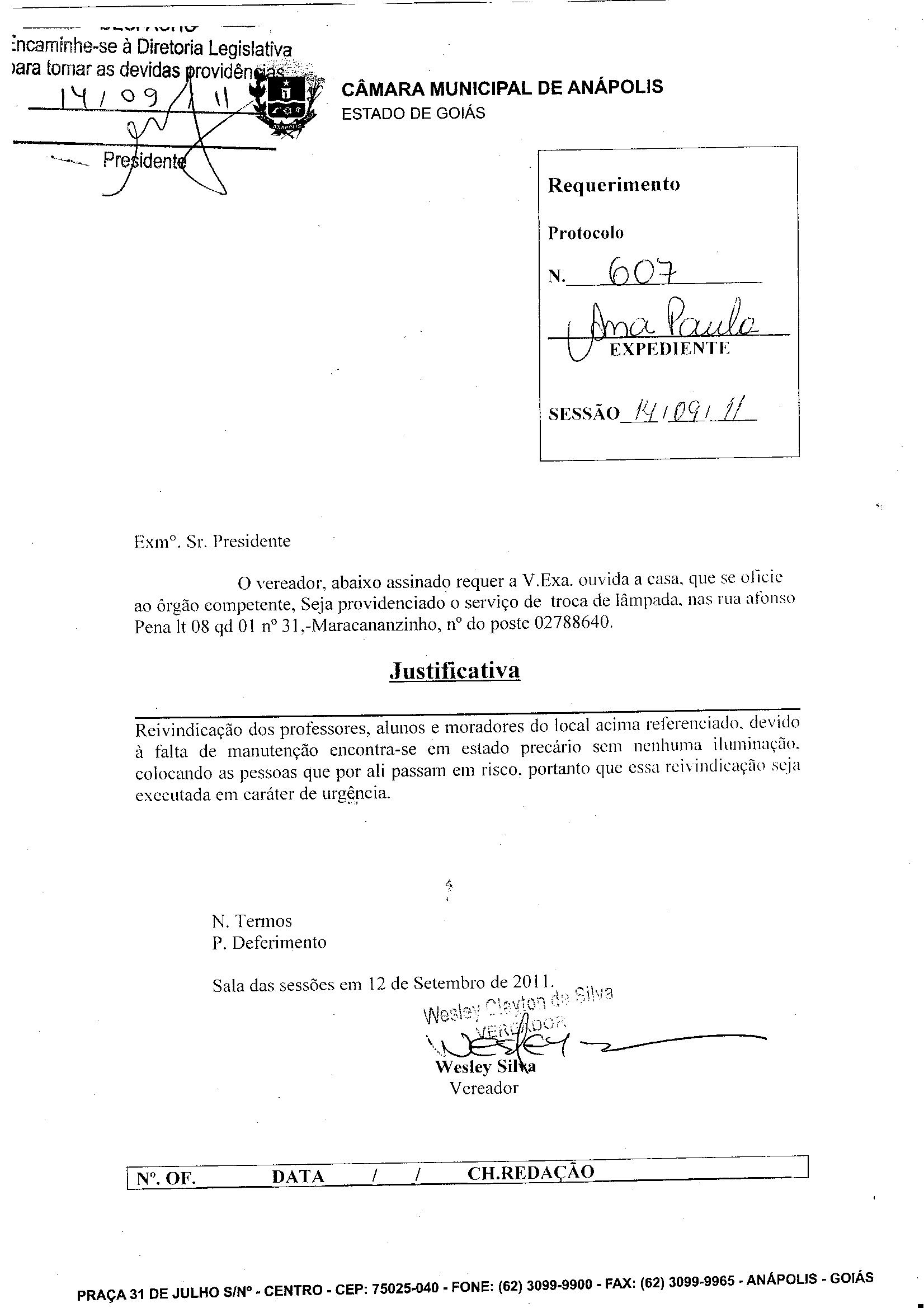 Ementa: O VEREADOR ABAIXO ASSINADO REQUER A V.EXA, OUVIDA A CASA, QUE SE OFICIE AO ÔRGÃO COMPETENTE, SEJA PROVIDENCIADO O SERVIÇO DE TROCA DE LÂMPADA, NAS RUAS AFONSO PENA LT08 QD01 N° 31 MARACANANZINHO N° DO POSTE 02788640.