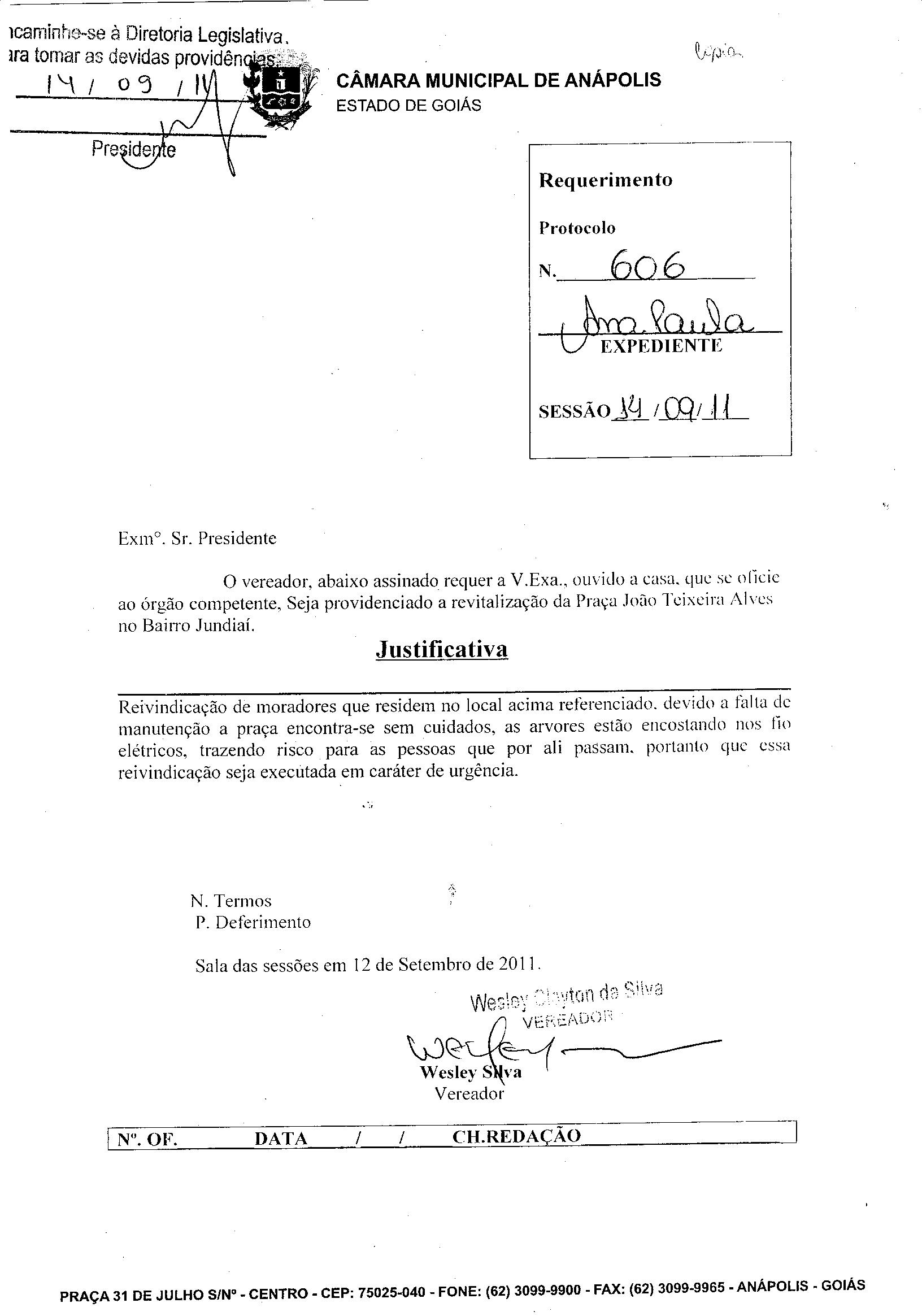 Ementa: O VEREADOR ABAIXO ASSINADO REQUER A V.EXA., OUVIDO A CASA, QUE SE OFICIE AO ÓRGÃO COMPETENTE. SEJA PROVIDENCIADO A REVITALIZAÇÃO DA PRAÇA JOÃO TEIXEIRA ALVES NO BAIRRO JUNDIAI.
