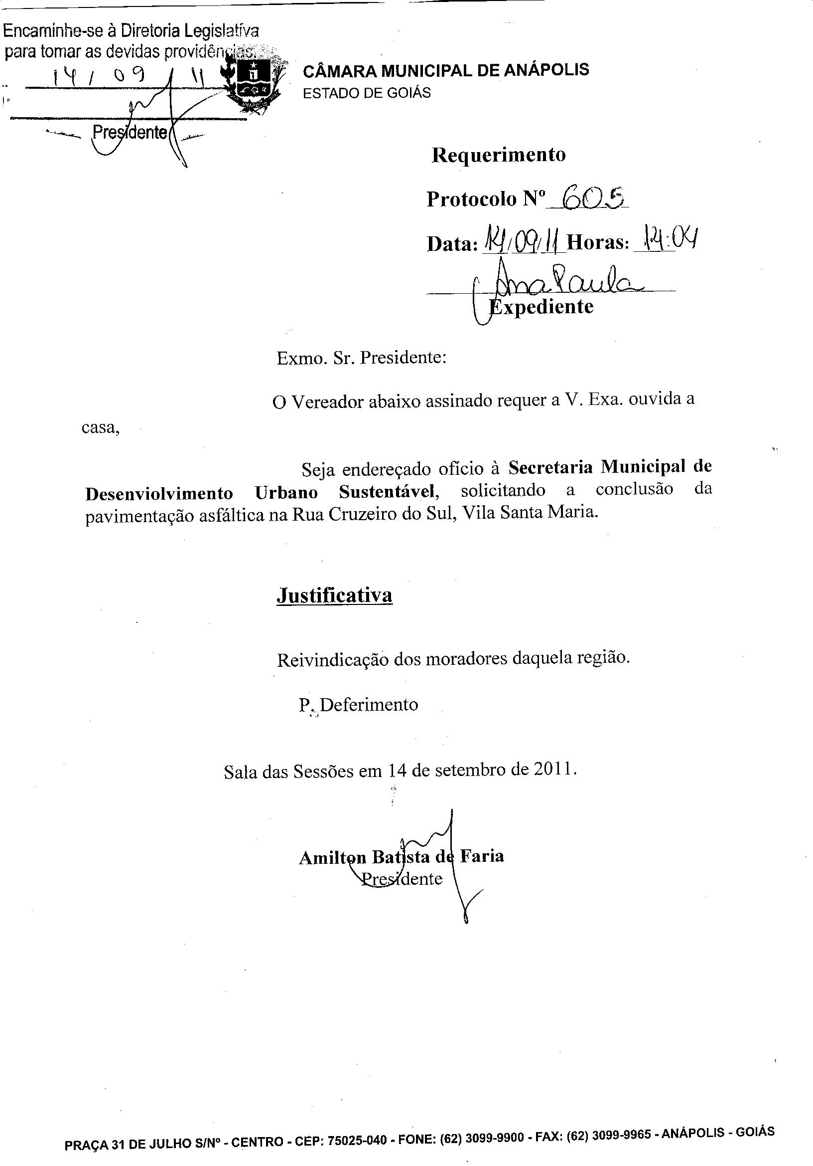 Ementa: O VEREADOR ABAIXO ASSINADO REQUER A V.EXA. OUVIDA A CASA, SEJA ENDEREÇADO OFÍCIO À SECRETARIA MUNICIPAL DE DESENVOLVIMENTO URBANO SUSTENTAVEL, SOLICITANDO A CONCLUSÃO DA PAVIMENTAÇÃO ASFÁLTICA NA RUA CRUZEIRO DO SUL, VILA SANTA MARIA.