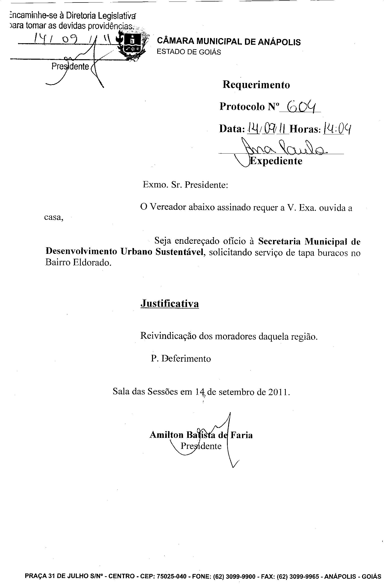 Ementa: O VEREADOR ABAIXO ASSIANDO REQUER A V.EXA. OUVIDA A CASA, SEJA ENDEREÇADO OFÍCIO À SECRETARIA MUNICIPAL DE DESENVOLVIMENTO URBANO SUSTENTAVEL, SOLICITANDO SERVIÇO DE TAPA BURACOS NO BAIRRO ELDORADO.