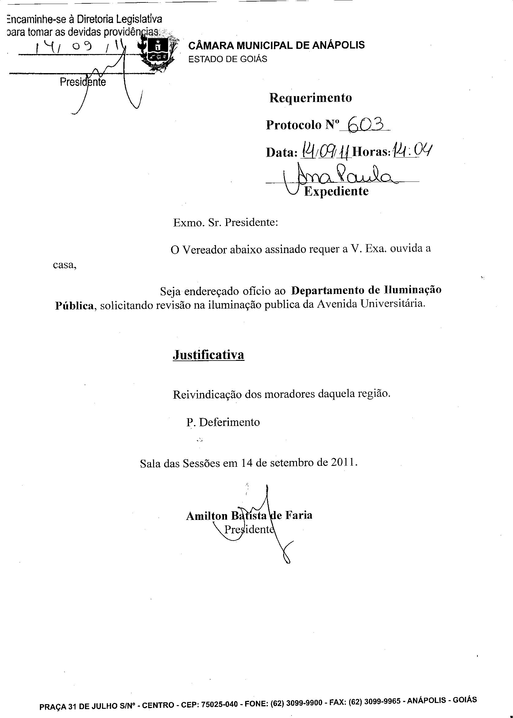 Ementa: O VEREADOR ABAIXO ASSINADO REQUER A V.EXA. OUVIDA A CASA, SEJA ENDEREÇADO OFÍCIO AO DEPARTAMENTO DE ILUMINAÇÃO PÚBLICA, SOLICITANDO REVISÃO NA ILUMINAÇÃO PUBLICA DA AVENIDA UNIVERSITÁRIA.