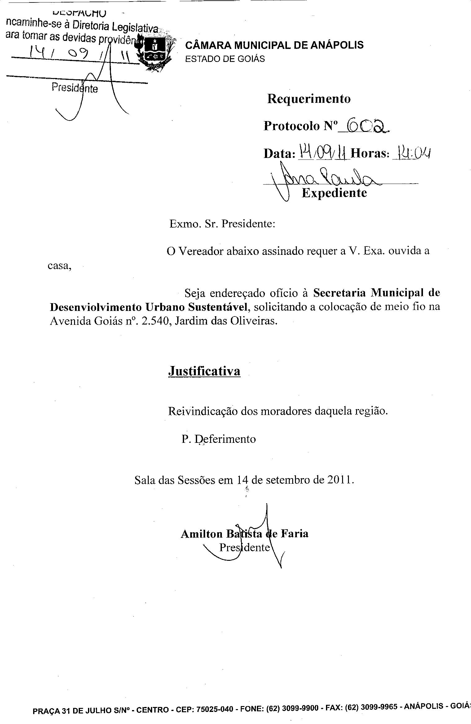 Ementa: O VEREADOR ABAIXO ASSINADO REQUER A V.EXA. OUVIDA A CASA, SEJA INDEREÇADO OFÍCIO À SECRETARIA MUNICIPAL DE DESENVOLVIMENTO URBANO SUSTENTÁVEL, SOLICITANDO A COLOCAÇÃO DE MEIO FIO NA AVENIDA GOIÁS N°.2.540, JARDIM DAS OLIVEIRAS.