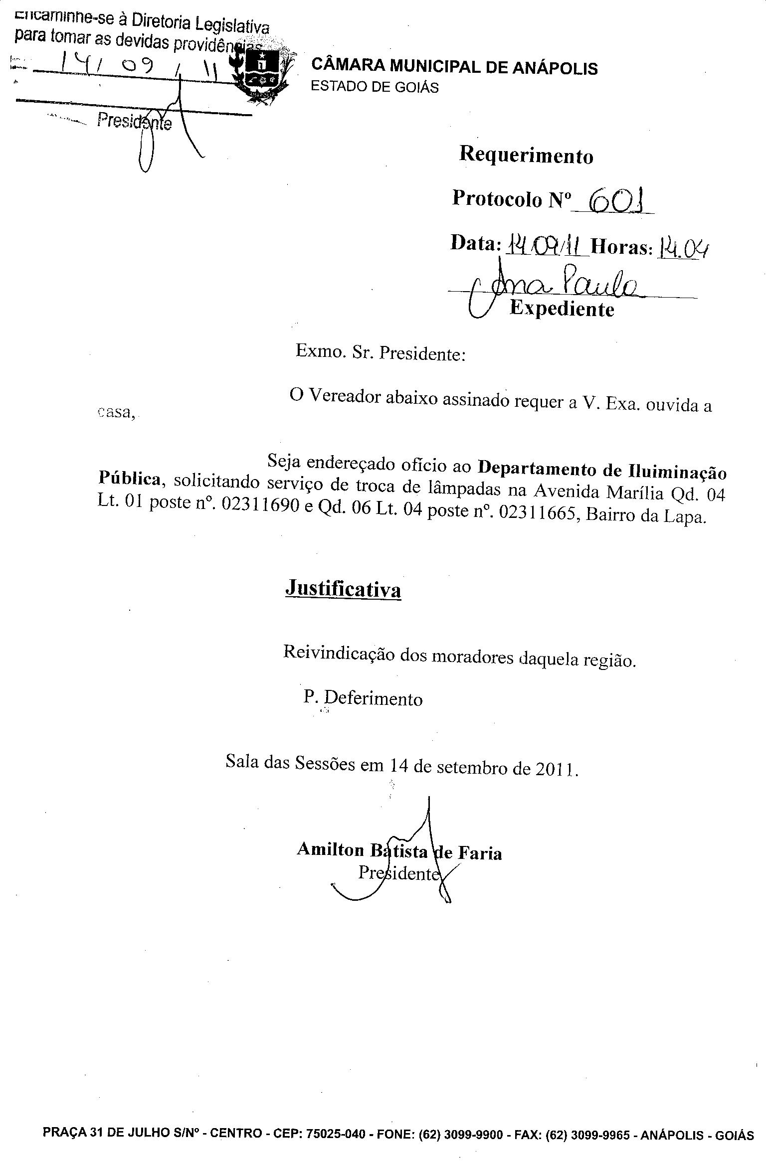 Ementa: O VEREADOR ABAIXO ASSINADO REQUER A V. EXA. OUVIDA A CASA, SEJA ENDEREÇADO OFÍCIO AO DEPARTAMENTO DE ILUMINAÇÃO PUBLICA, SOLICITANDO SERVIÇO DE TROCA DE LÂMPADAS NA AVENIDA MARÍLIA QD. 04 LT.01 POSTE N°. 02311690 E QD.06 LT.04 POSTE N°. 02311665, BAIRRO DA LAPA.
