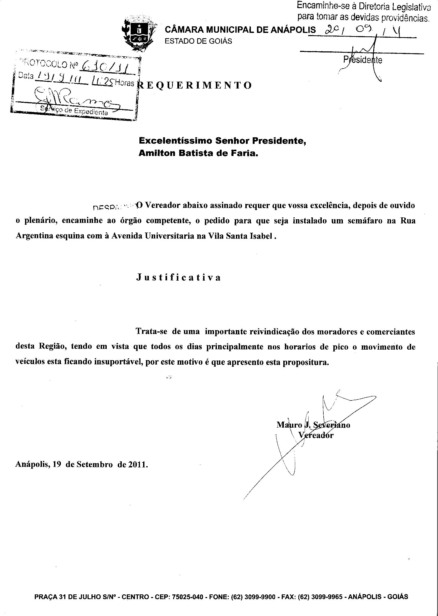 Ementa: O VEREADOR ABAIXO ASSINADO REQUER QUE VOSSA EXCELÊNCIA, DEPOIS DE OUVIDO O PLÉNARIO, ENCAMINHE AO ÓRGÃO COMPETENTE, O PEDIDO PARA QUE SEJA INSTALADO UM SEMÁFARO NA RUA ARGENTINA ESUINA COM À AVENIDA UNIVERSSITARIA NA VILA SANTA ISABEL.