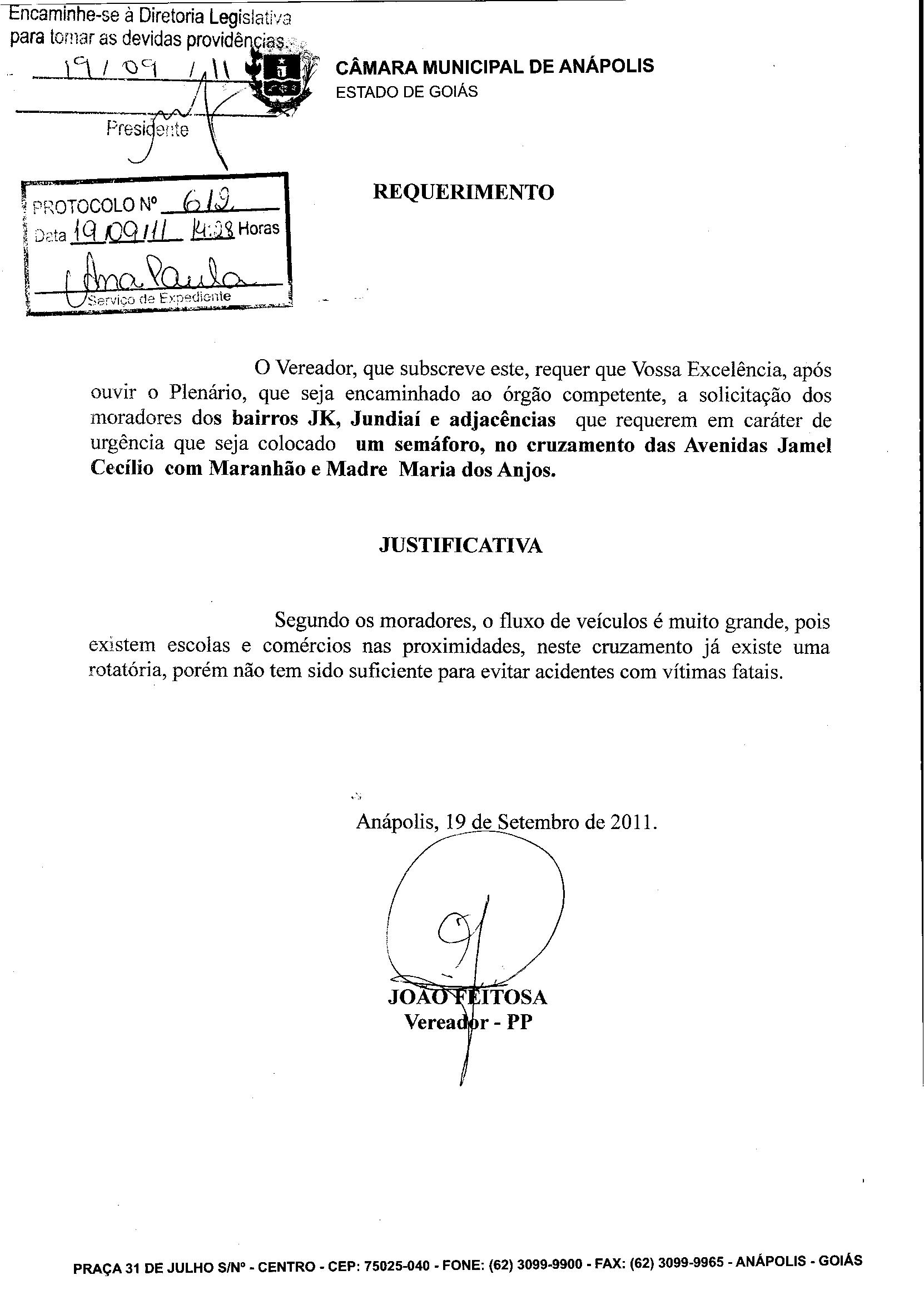 Ementa: O VEREADOR, QUE SUBSCREVE ESTE, REQUER QUE VOSSA EXCELÊNCIA, APÓS OUVIR O PLENÁRIO, QUE SEJA ENCAMINHADO AO ÓRGÃO COMPETENTE, A SOLICITAÇÃO DOS MORADORES DOS BAIRROS JK, JUNDIAÍ E ADJACÊNCIAS QUE REQUEREM EM CARÁTER DE URGÊNCIA QUE SEJA COLOCADO EM SEMÁFOTO, NO CRUZAMENTO DAS AVENIDAS JAMEL CECÍLIO COM MARANHÃO E MADRE MARIA DOS ANJOS.