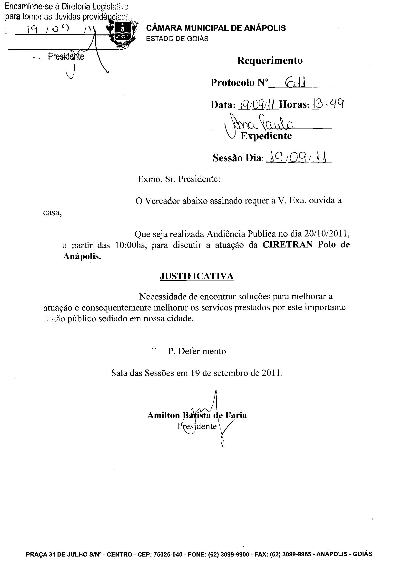 Ementa: O VEREADOR ABAIXO ASSINADO REQUER A V.EXA. OUVIDA A CASA, QUE SEJA REALIZADA AUDIENCIA PUBLICA NO DIA 20/10/2011, A PARTIR DAS 10:00HS, PARA DISCUTIR A ATUAÇÃO DA CIRETRAN POLO DE ANÁPOLIS.